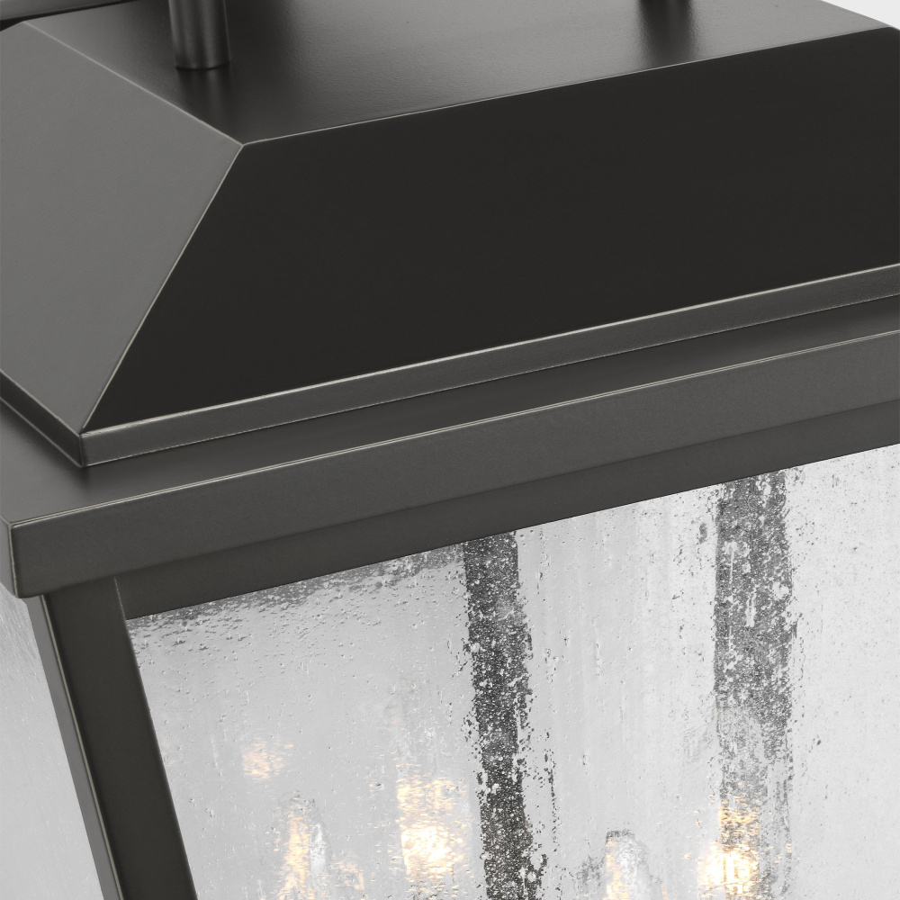 Crafted with Aluminum in a Antique Bronze finish with clear seeded glass shades
