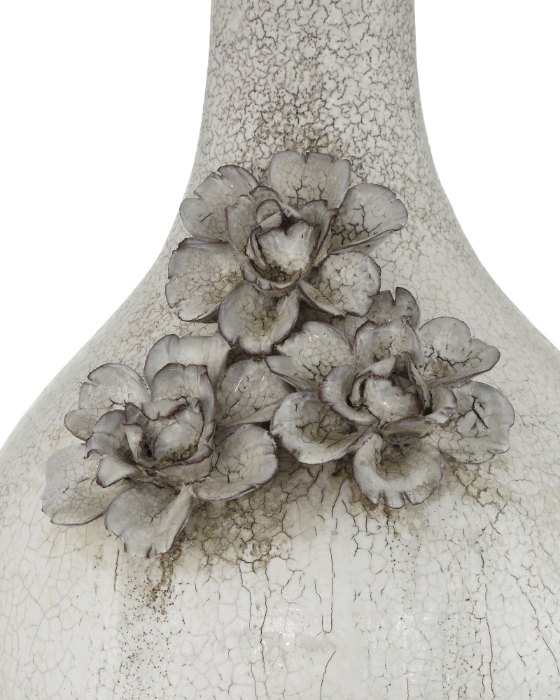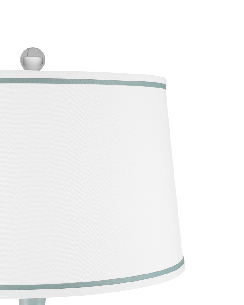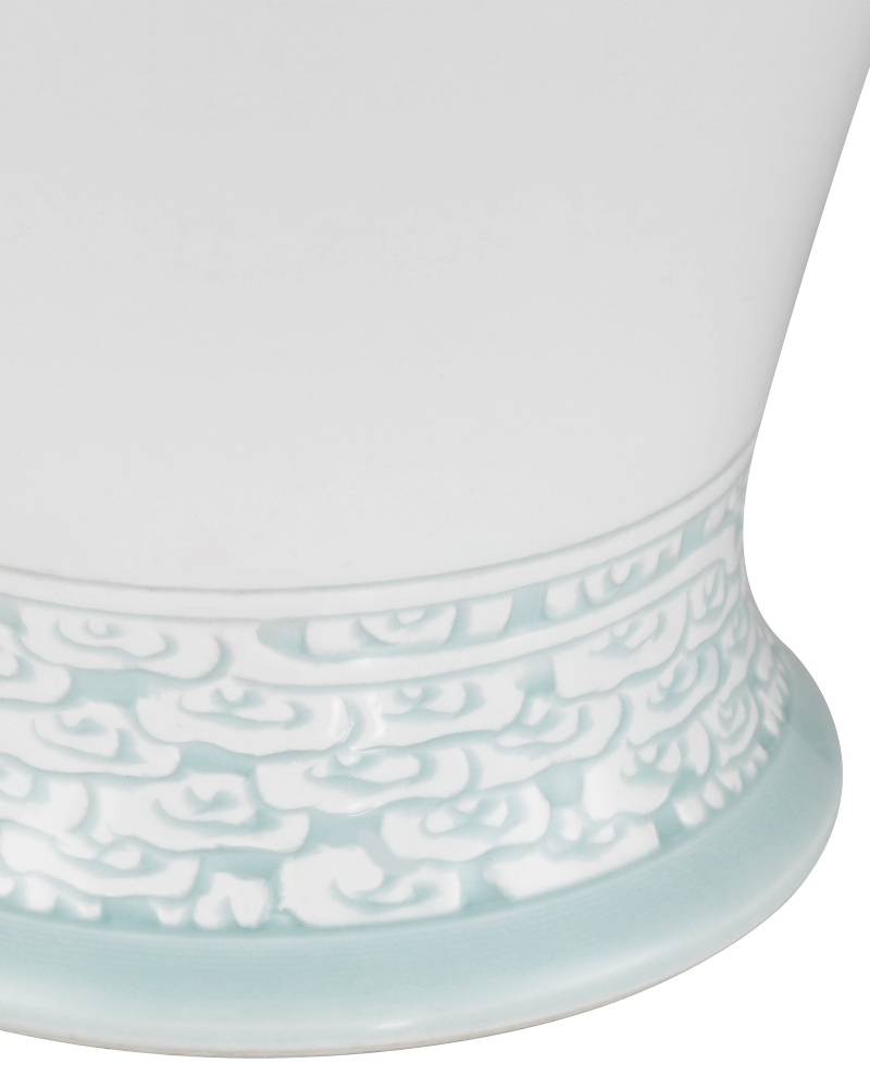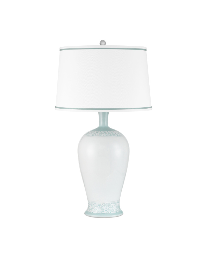 The baluster shape and Ming-Dynasty motifs on the Ketty Green Table Lamp bring it a classic Chinoiserie feel that is echoed by the double-trimmed shade. The porcelain body is white where it is left unpainted, the celadon glazing that depicts cloud motifs defining its timeless style. The polished nickel finial crowns this lamp.