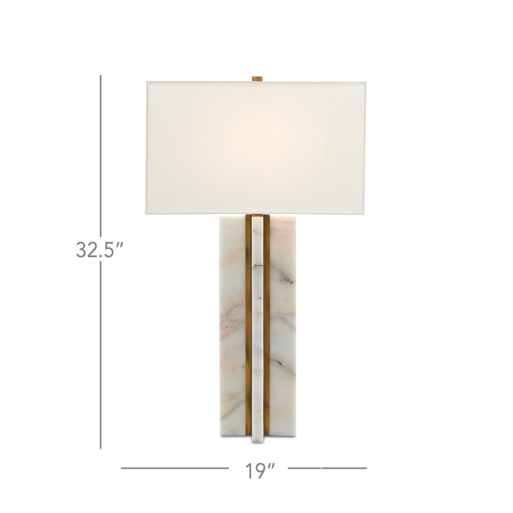 Slabs of marble intersected by metal in an antique brass finish have never looked so modern as they do in the Khalil Table Lamp. The patinated metal brings out the salmon-colored tones and the rectangular off-white shantung shade adds to the smartness of this marble lamp.