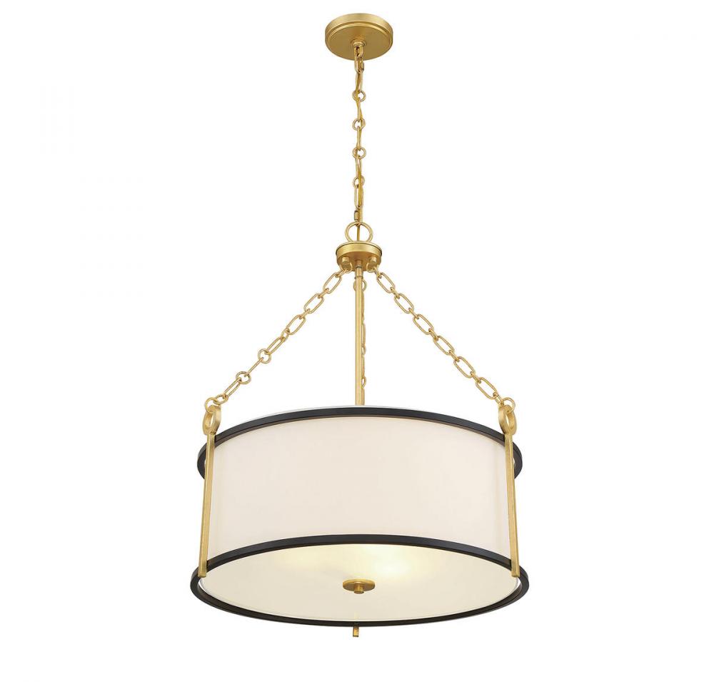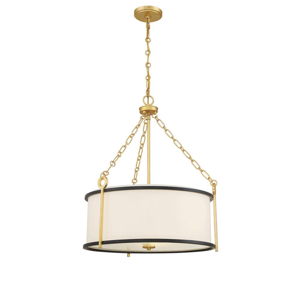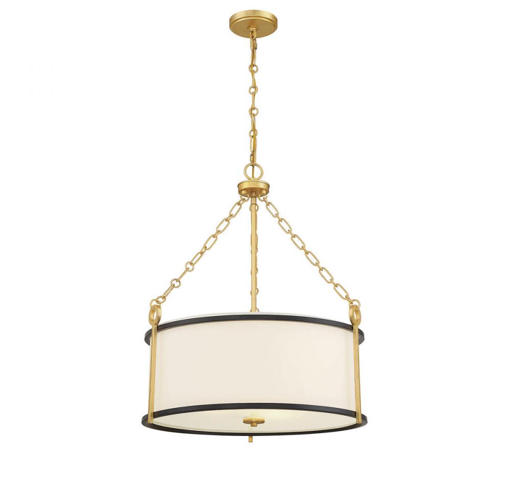 In the Savoy House Kian 3-light pendant light, drum pendant style is given a subtly glamorous twist with matte black banding and gold hardware detailing. Use it solo to spotlight its intricacies or in a group to create a lovely lighting look. Kian is 26" in height and 22" in diameter. It uses three standard size bulbs of up to 60 watts per bulb. Comes with 120" of chain and 144" of cord.
