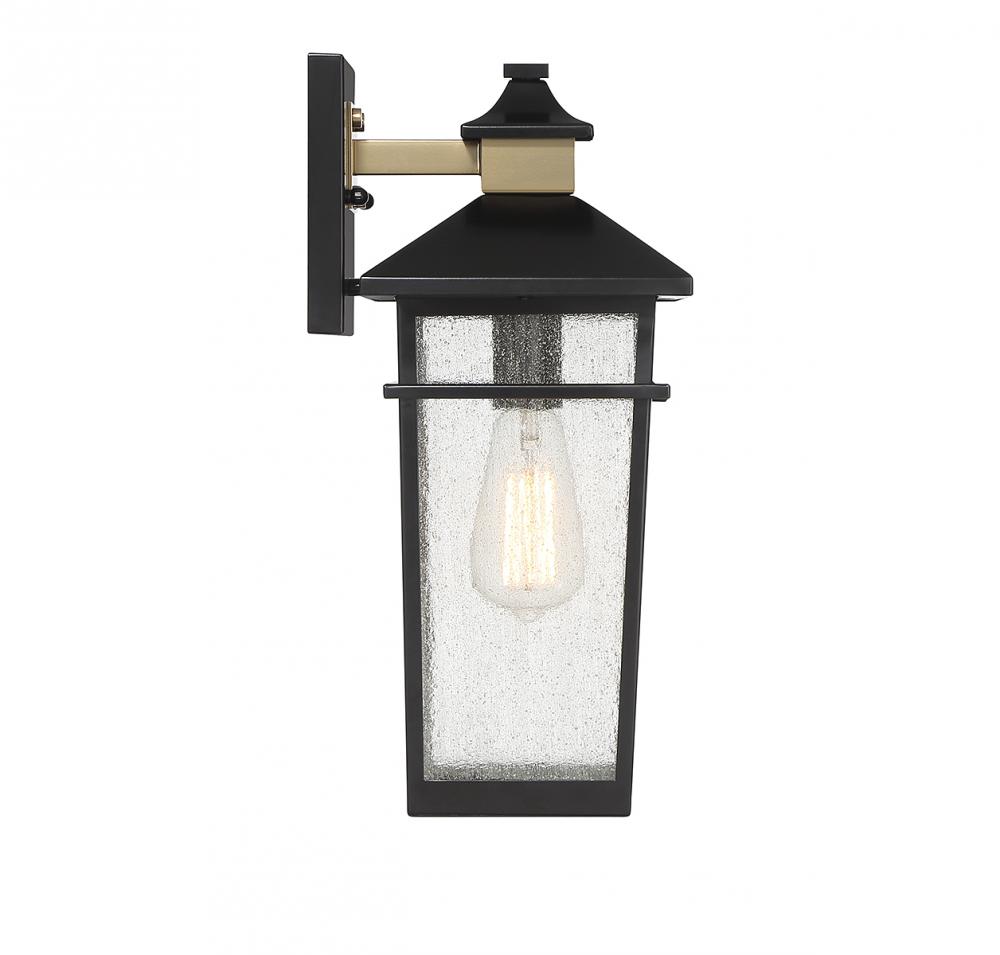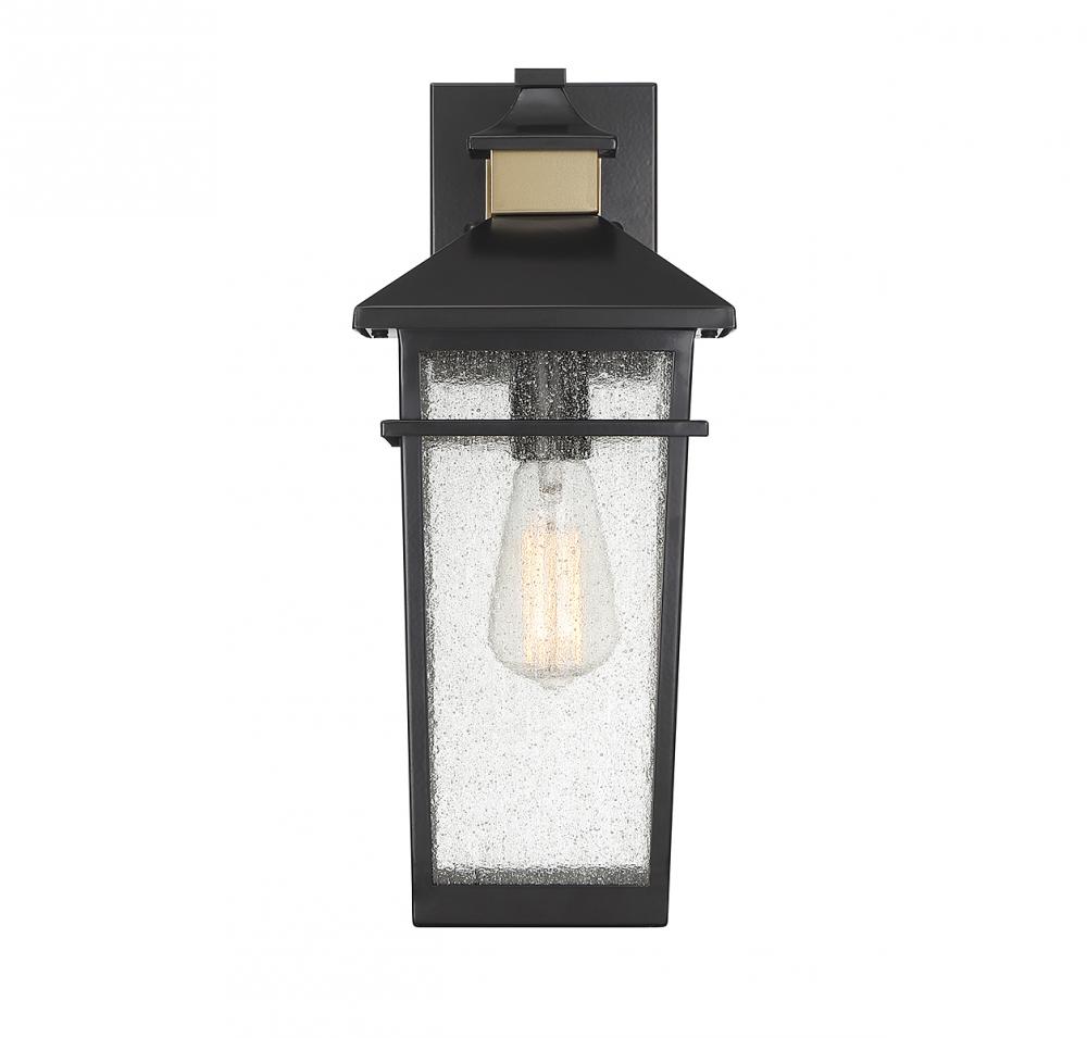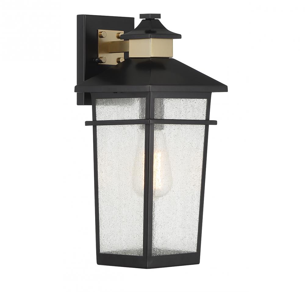 This Savoy House Kingsley 1-light outdoor wall light has a coastal-inspired lantern style with highly fashionable touches. Panes of seedy glass are accentuated by a matte black finish with brass detailing at the backplate and hood. Kingsley is 16.25" in height, 7" in width and extends 8.25" from the wall. It uses 1 standard size bulb with a max of 60 watts (bulb not included).