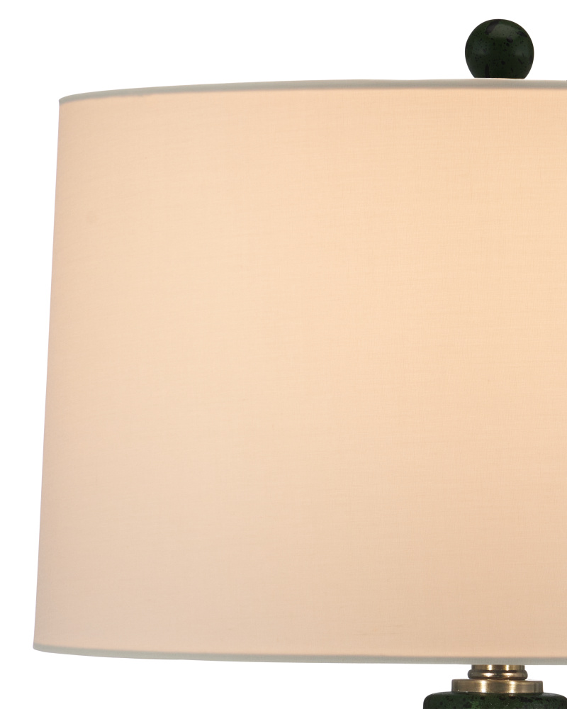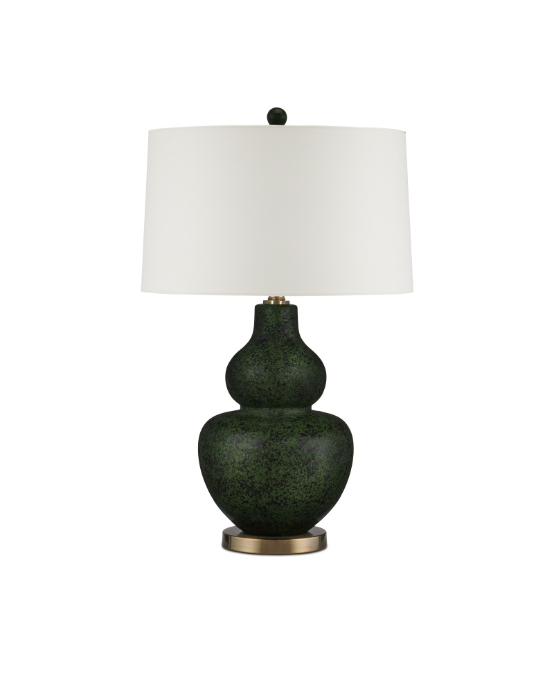 The splatter finish on the double-gourd-shaped body of the Kinnaird Table Lamp brings the green lamp the feeling that it is artfully aged. Made of ceramic, the glazing is splashed in shades of moss green, the color carried through to the matching finial. The metal base and hardware are made of metal in an antique brass finish to complete the traditional feel of this fixture.