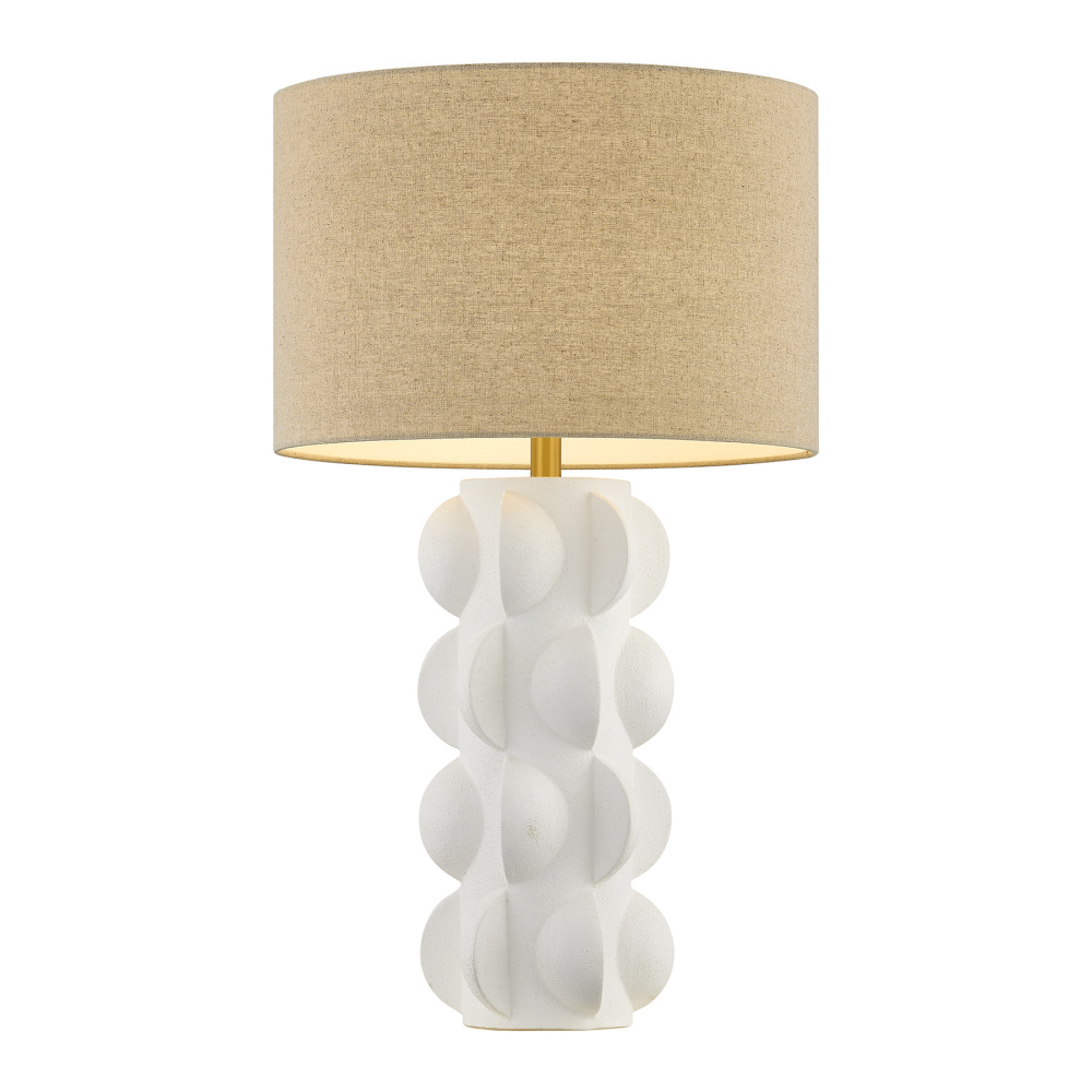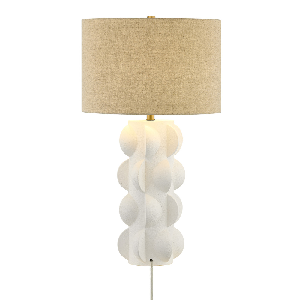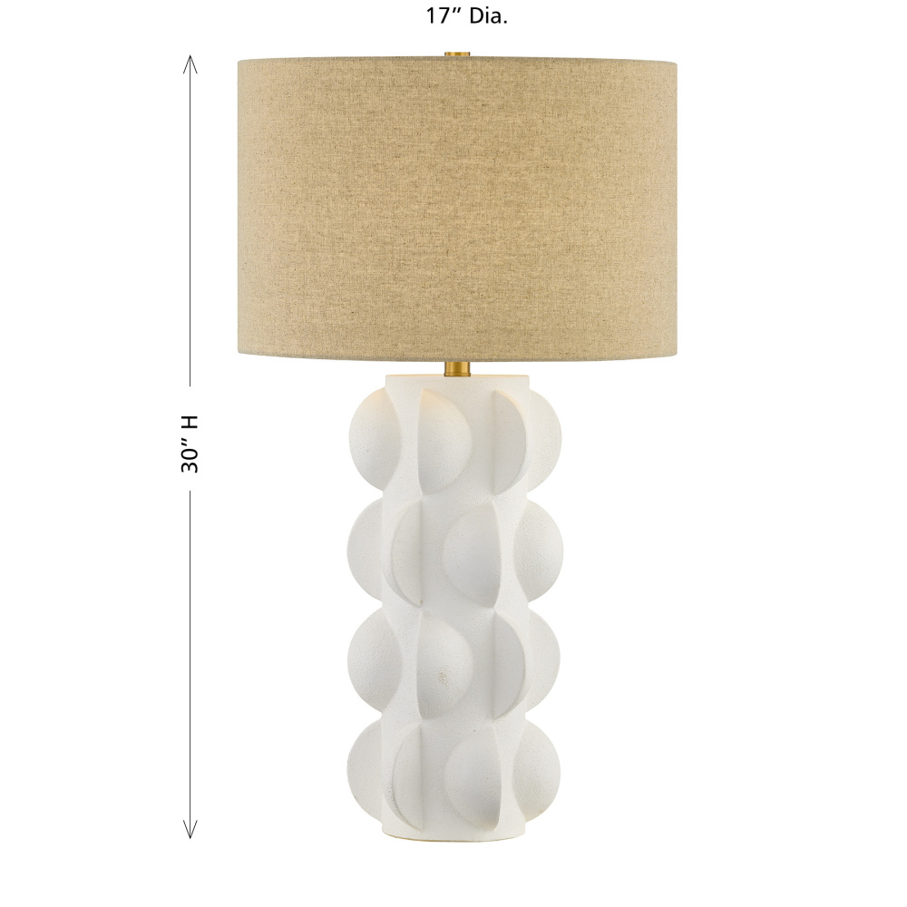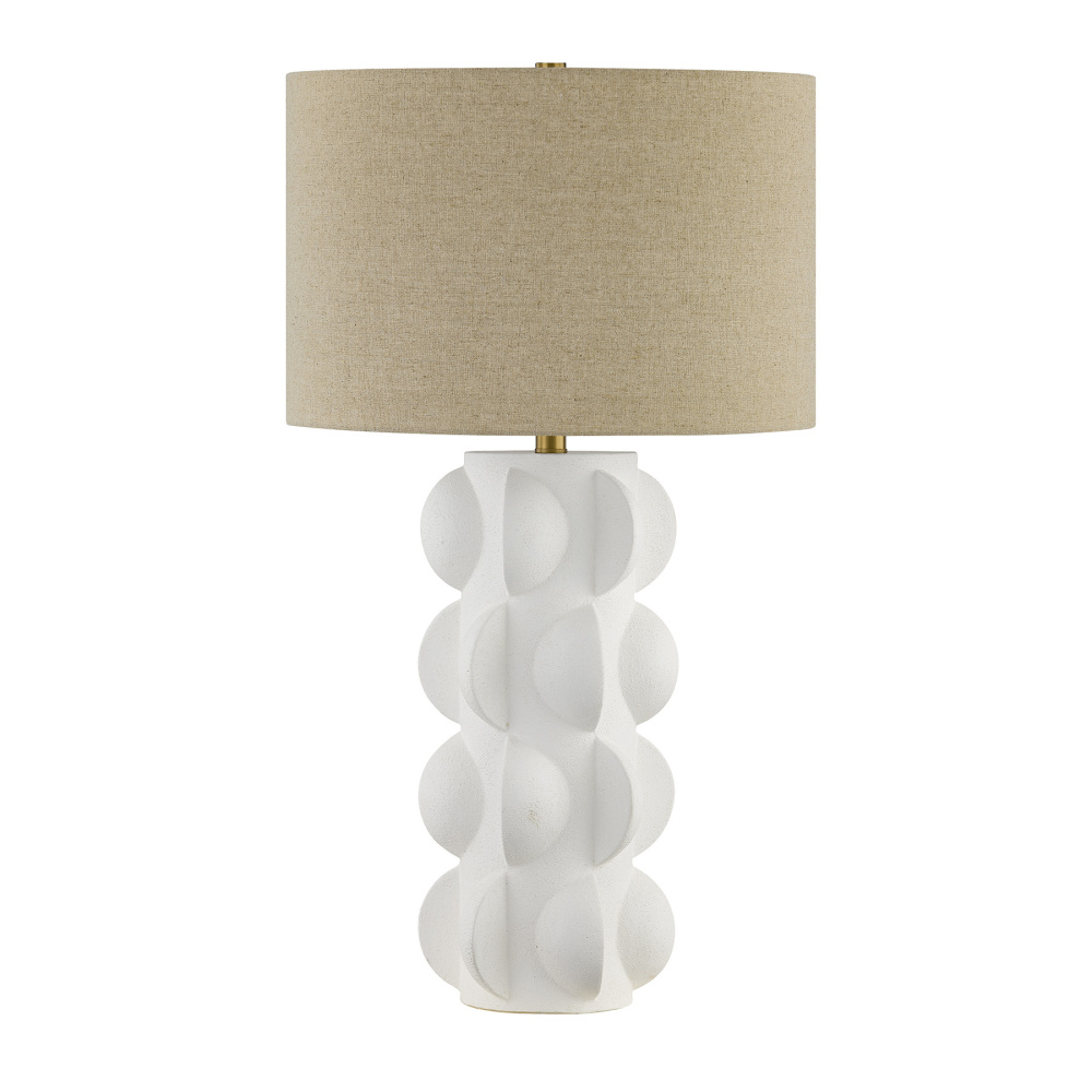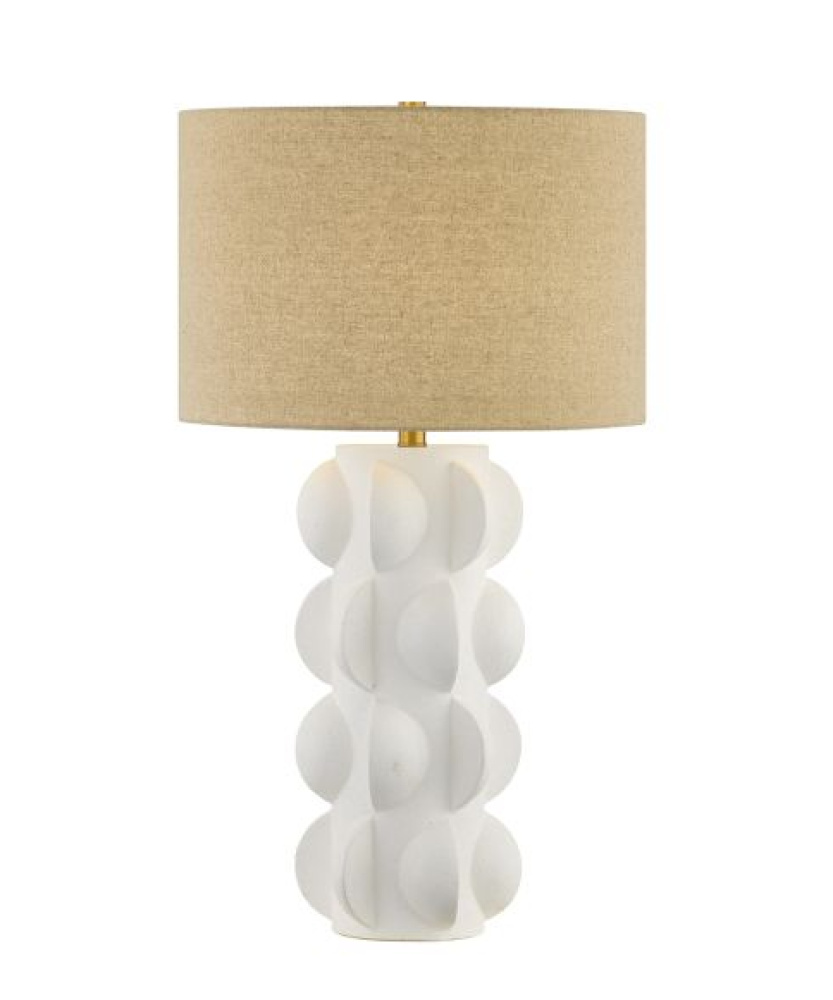 The Savoy House Kirkwall 1-light table lamp was designed by Dann Foley, an award-winning interior designer with a reputation for style, taste and quality. Its ceramic body showcases dimensional half-moon accents that add fresh, sculptural interest. A sand fabric shade and Warm Brass finish introduce warm, organic-inspired elegance. Kirkwall is 30" in height and 17" in width. It uses one standard size bulb of up to 100 watts. Bulb not included.