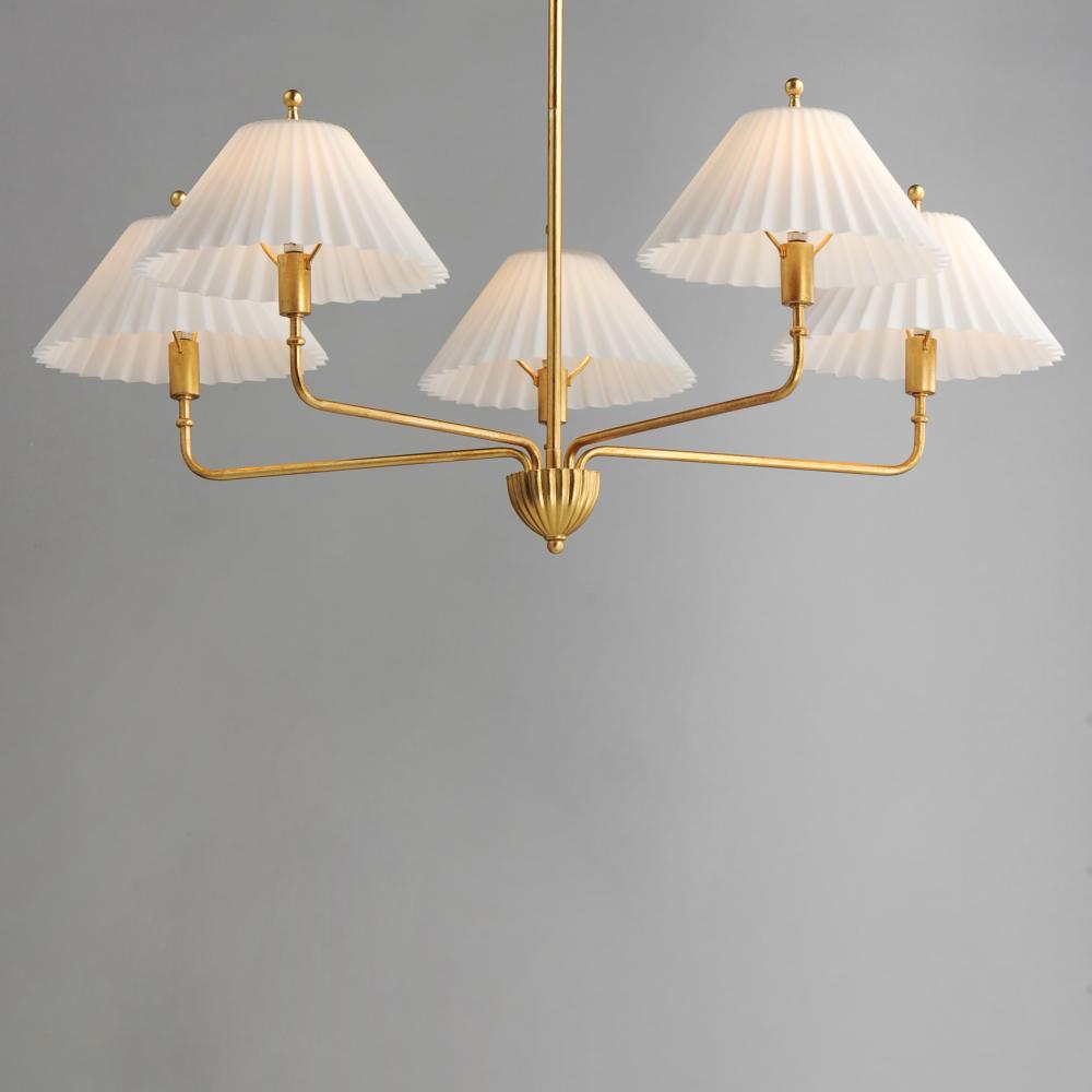 Touches of biophilic details and charming Satin White glass shades modeled on pleated fabric shades create elegant and approachable lighting fixtures. Finished in a rich hand-applied gold leaf, the elongated frame of the chandelier and upturned sconce take