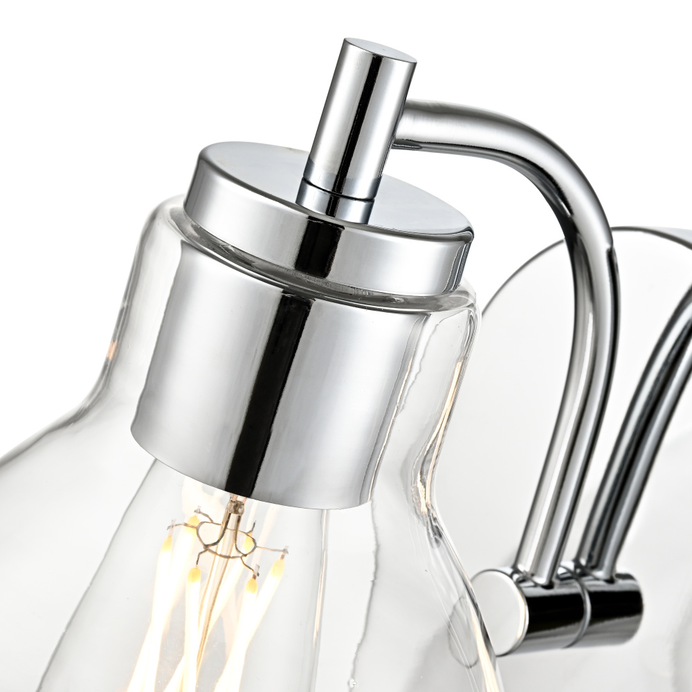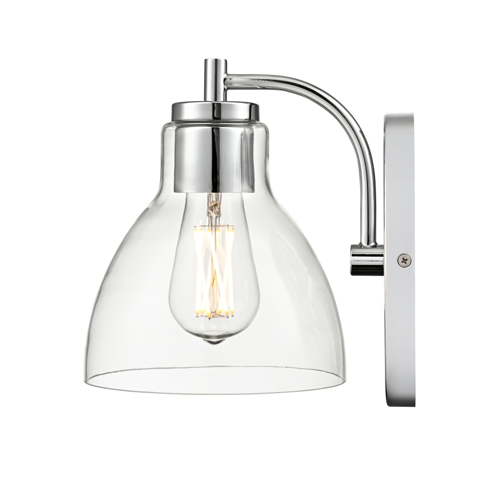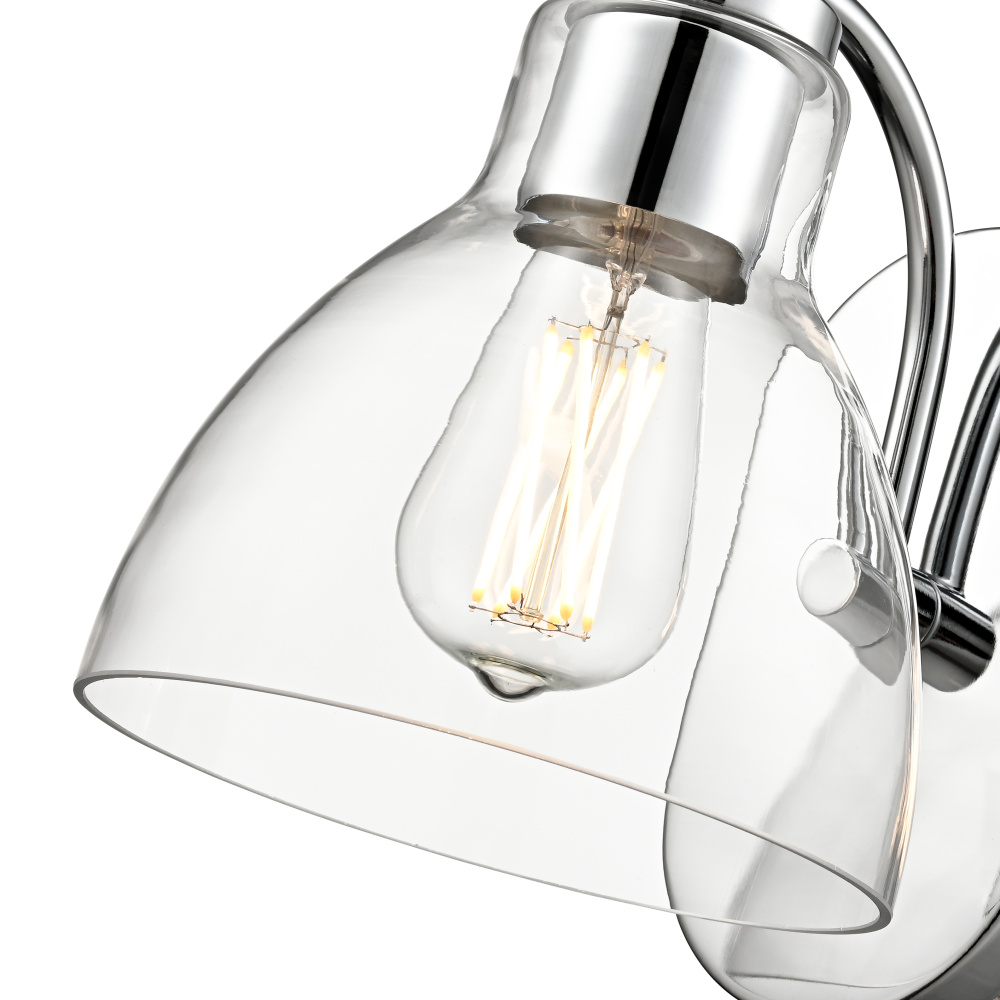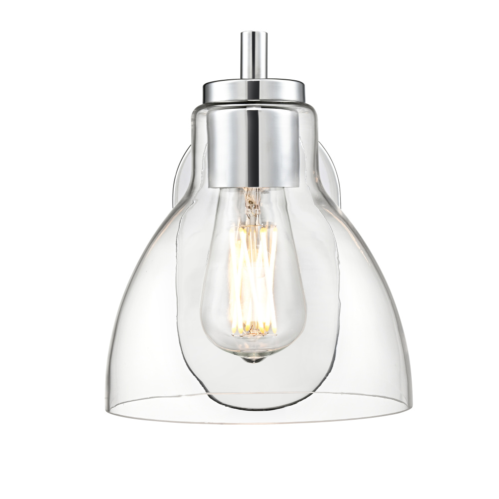 Refined simplicity is the hallmark of the Knightsdale Family of vanity lighting. Graceful bell-shaped clear glass shades set an elegant tone and provide a crisp clear lighting effect perfect for any bath. The minimalistic hardware strikes the perfect balance with the shades and is finished in matte black, chrome, or modern gold. Available as 1, 2 and 3-light options, these fixtures create a sleek and understated profile.