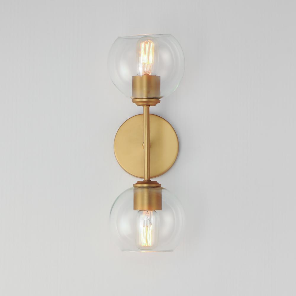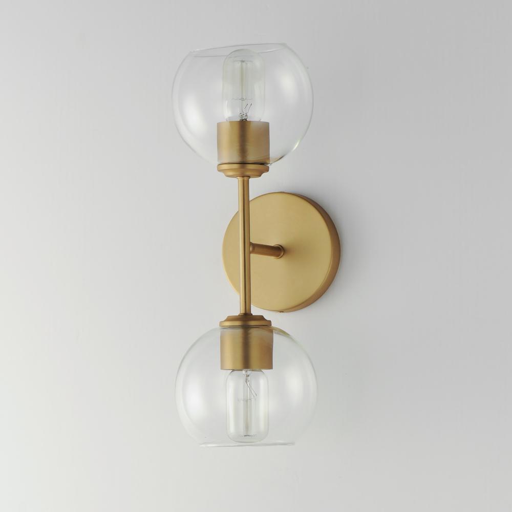 Clear glass globes on a Natural Aged Brass frame create a transitional design that is sure to please. The sloping arms level out to create a simple Mid Century Modern configuration. A full range of the products in this collection include chandeliers, penda