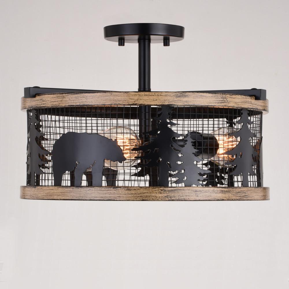 Get wild with this drum style ceiling light called Kodiak. The pairing of the black and burnished teak finish enhances the on-trend metal cage perfectly. Capture your love of nature with pine tree and bear silhouettes. It is an excellent choice for a vacation lodge, cabin or suburban home and complements a variety of home styles: anywhere you want to bring an element of nature. Rated for damp locations, it can be used in any bathroom, family room, or any other area of your home.