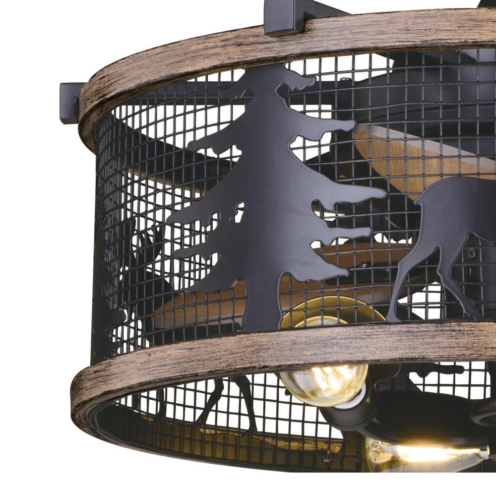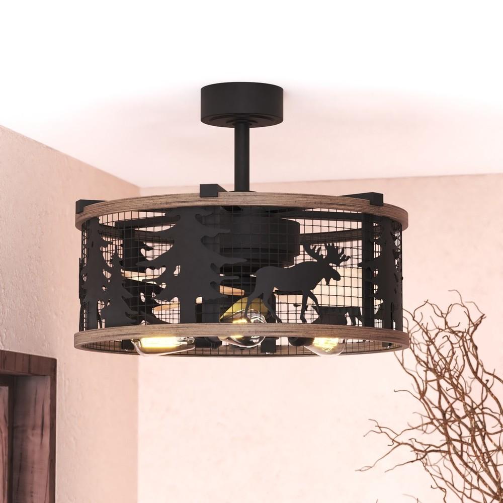 Get wild with this indoor-outdoor drum style ceiling fan called Kodiak. The pairing of the black and burnished teak finishes enhance the on-trend metal cage perfectly. Capture your love of nature with pine tree and moose silhouettes. It is a great choice for a vacation lodge, cabin or suburban home and will complement a variety of home styles: anywhere you want to bring in an element of nature. The included LED bulbs provides energy saving, low maintenance and long-lasting performance. Rated for damp locations, ideal for your covered porch, family room, or any other area of your home.