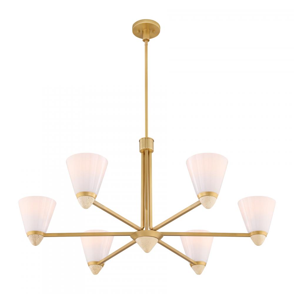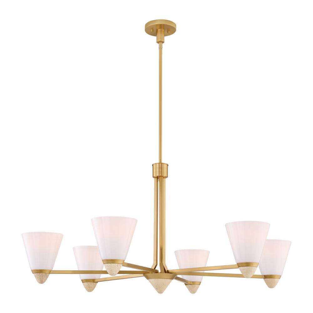 The Savoy House Kohlman 6-light chandelier is a perfect balance of the elegant and the organic. It flaunts conical shades of white opal glass paired with natural travertine accents and a Warm Brass finish. Another travertine accent serves as the finial of the chandelier. Kohlman is 40" in width and has an adjustable height ranging from 18" to 72". It uses six standard size bulbs of up to 60 watts per bulb. Bulbs not included. Comes with four 12" downrods and one 6" downrod.