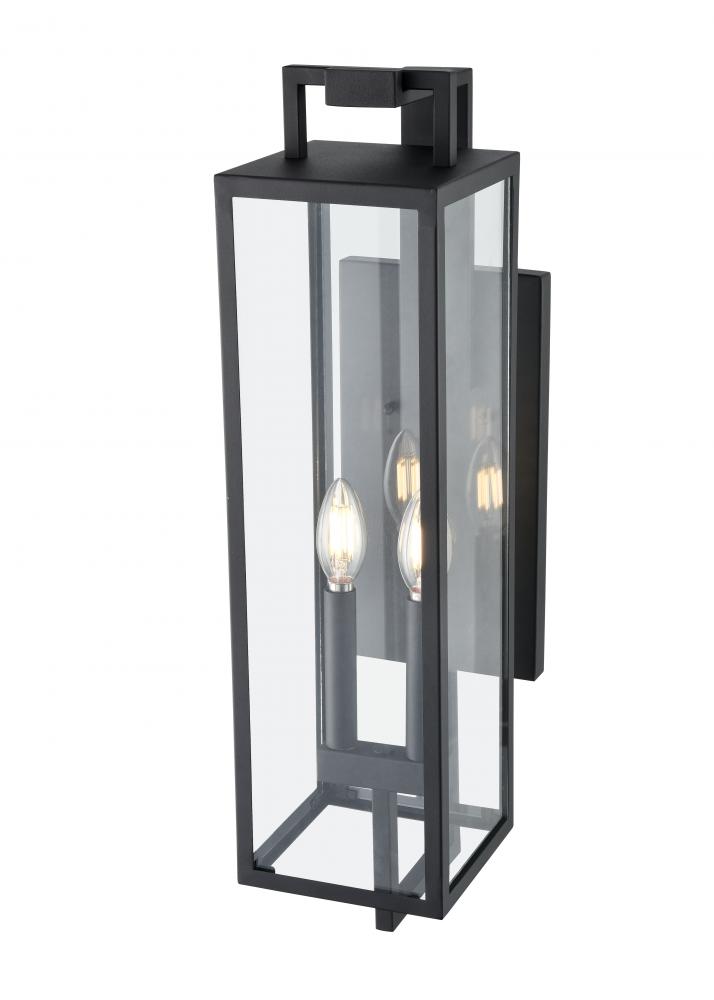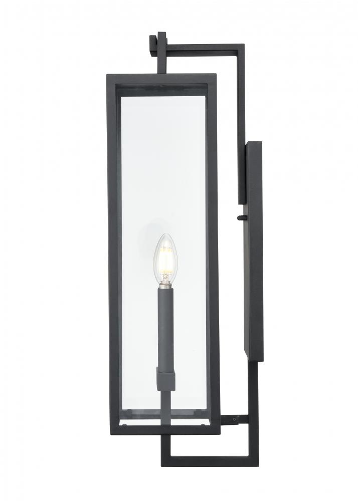 A contemporary interpretation of gothic Victorian design, the Lamont Collection of outdoor lighting is designed to make a bold visual impact on any entryway. The succinct lines of the steel framework create an elongated fixture finished in textured black. The partial, clear glass panels reveal classic-style candles in 1-light, 2-light, and 3-light options.