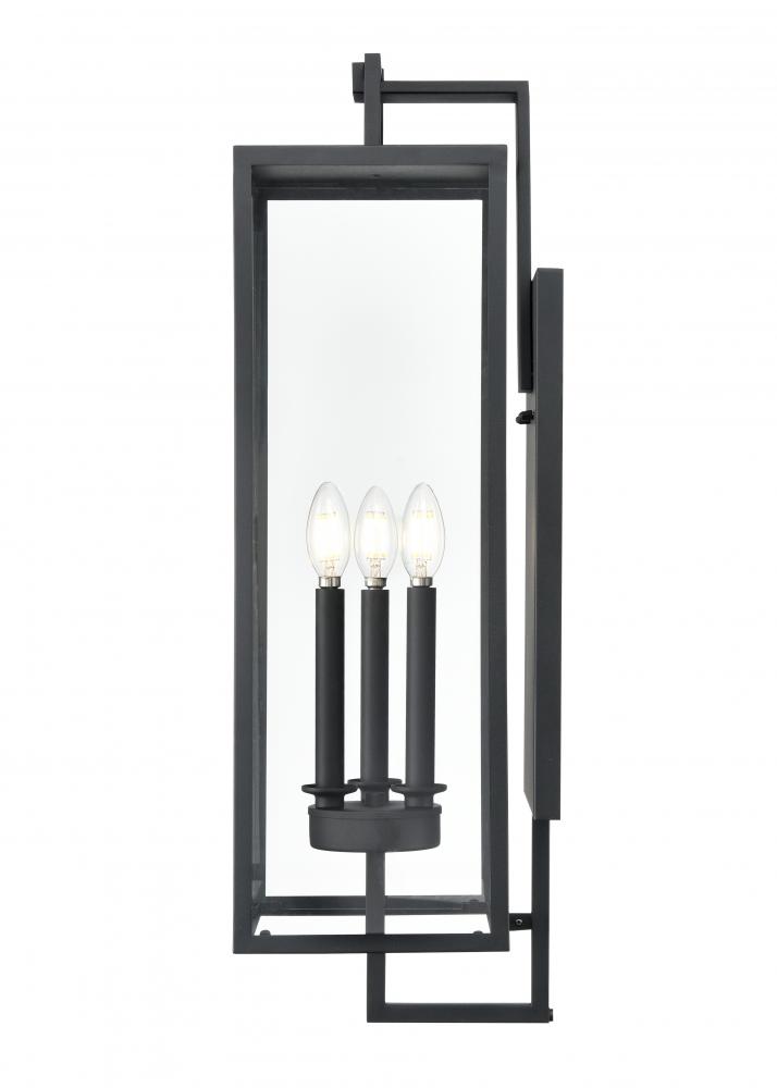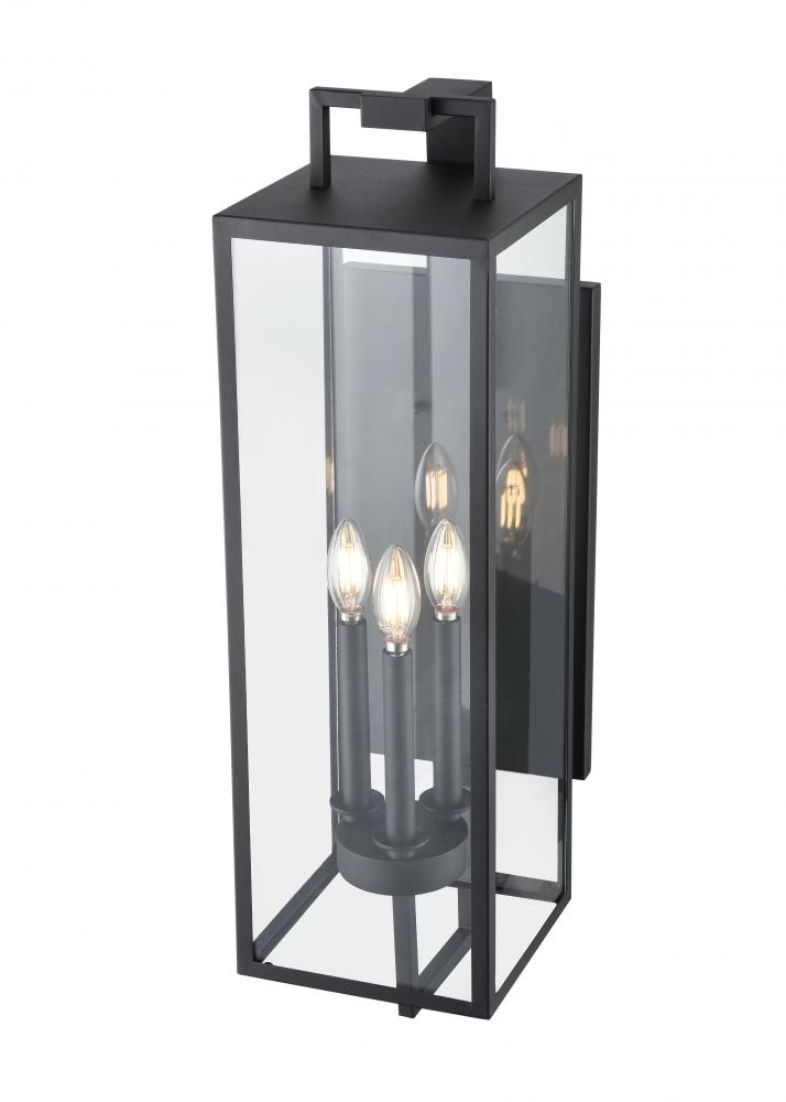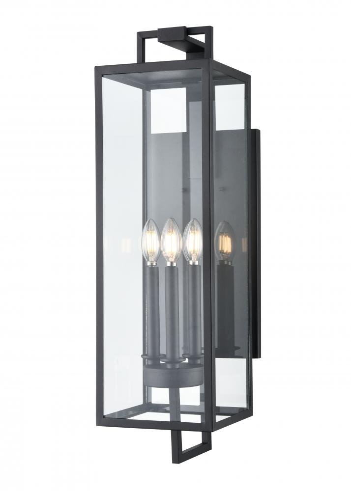 A contemporary interpretation of gothic Victorian design, the Lamont Collection of outdoor lighting is designed to make a bold visual impact on any entryway. The succinct lines of the steel framework create an elongated fixture finished in textured black. The partial, clear glass panels reveal classic-style candles in 1-light, 2-light, and 3-light options.