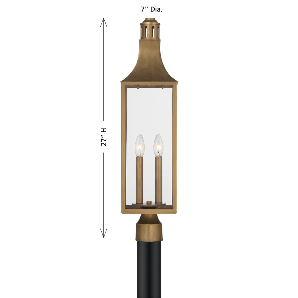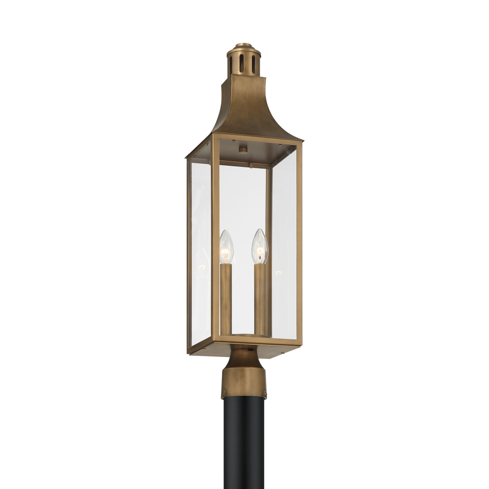 Create a welcoming, well-lit outdoor environment with the Savoy House Lancaster 2-light post mount lantern. Its traditional lantern architecture, complete with a graceful roof and chimney detailing, lends sophistication to walkways, driveways, or garden paths. Clear glass panels allow light to travel freely and are paired with the warm richness of Atlas Bronze. Lancaster stands 27" tall and 7" wide. Uses two candelabra bulbs of up to 60 watts each (not included). Wet area rated.
