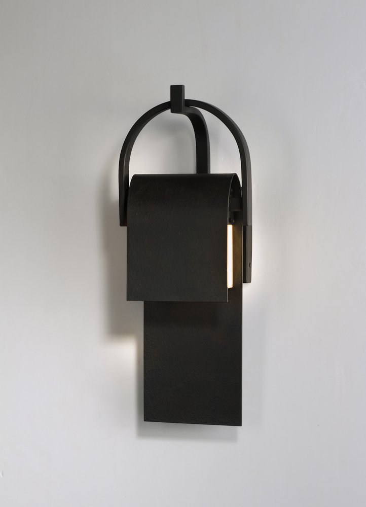 A panel of aluminum is bent forward at the top and cradled by a bracket. A beautiful textured Rustic Forged finish is used in keeping with the pastoral design elements. Cleverly concealed inside the arch is a LED light source which sheds ample light to the