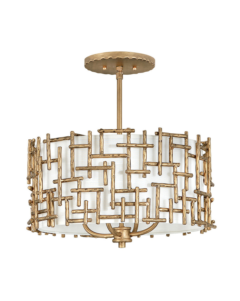 Farrah’s contemporary design is bold and sculptural, while achieving an optical airiness. The hand-hammered crosshatch bars gleam in a hand-applied Silver Leaf or Burnished Gold finish with artisanal detailing that carries through to the canopy detail. Set against a White Linen shade, Farrah creates a look of deconstructed; modern elegance.