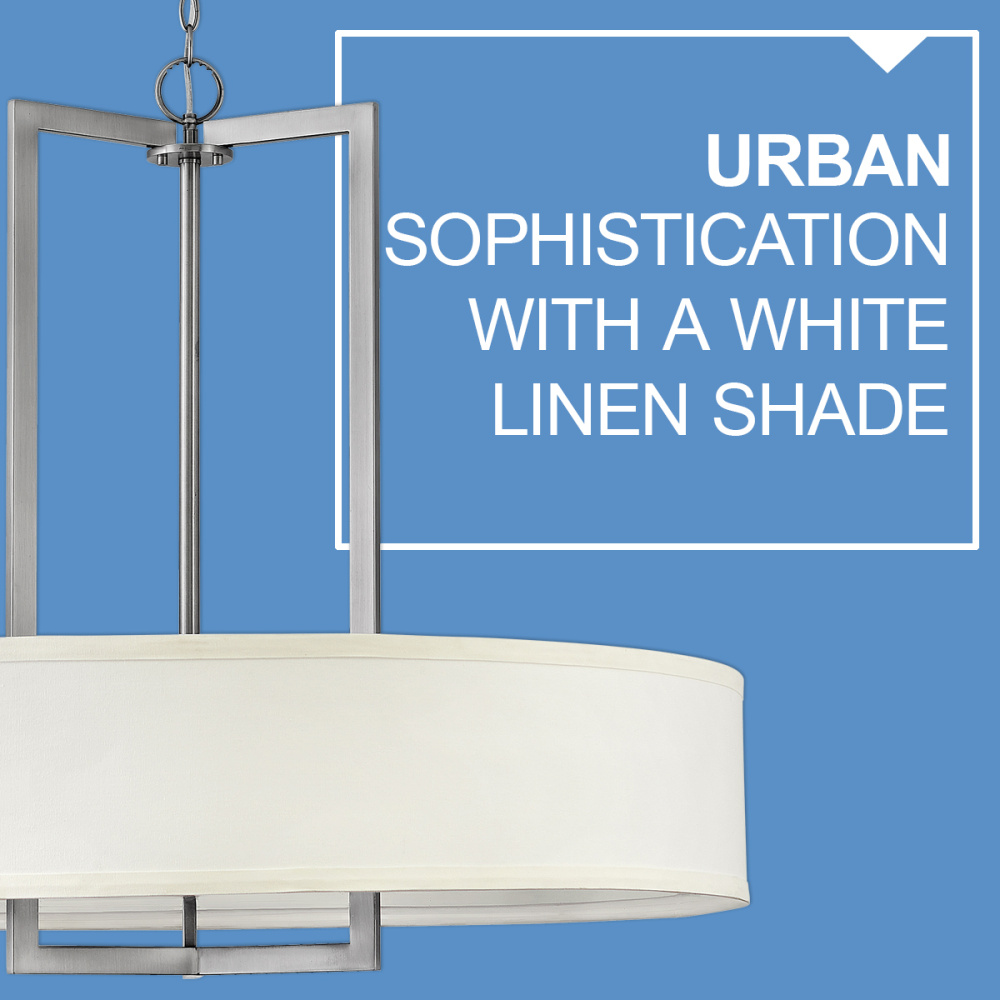 Hampton is a modern transitional design, offering the ultimate in urban sophistication. The minimal, rectangular frame is softened by a contemporary off-white linen drum shade.