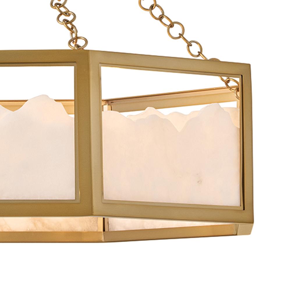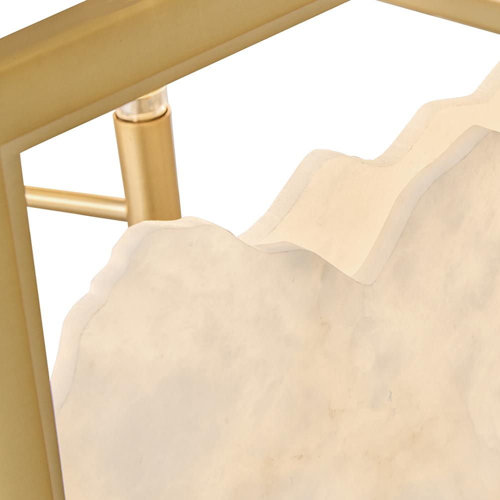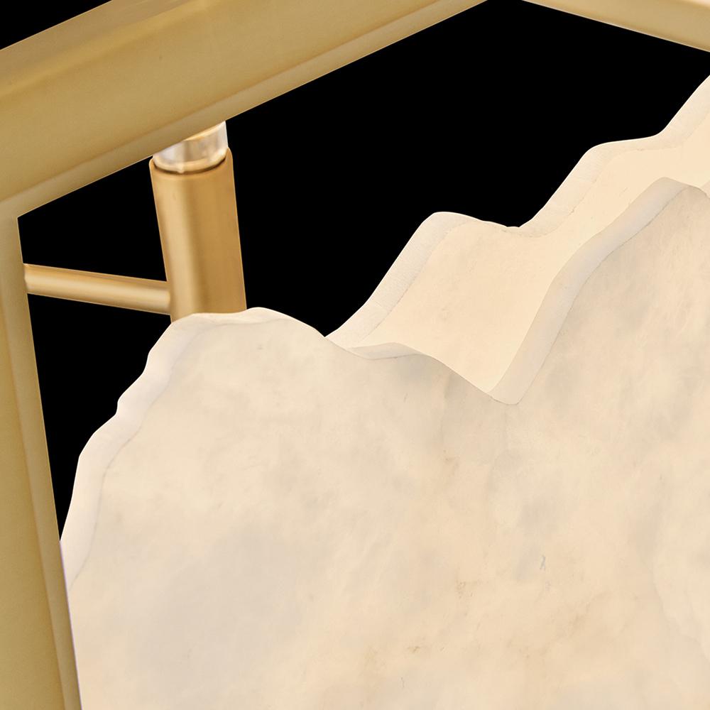 Inspired by Italian design, Valeta’s natural alabaster shade with jagged top edges is showcased by a geometric Lacquered Brass frame. Truly one-of-a-kind graining, color variations, and organically formed textures make each Veleta fixture genuinely unique.