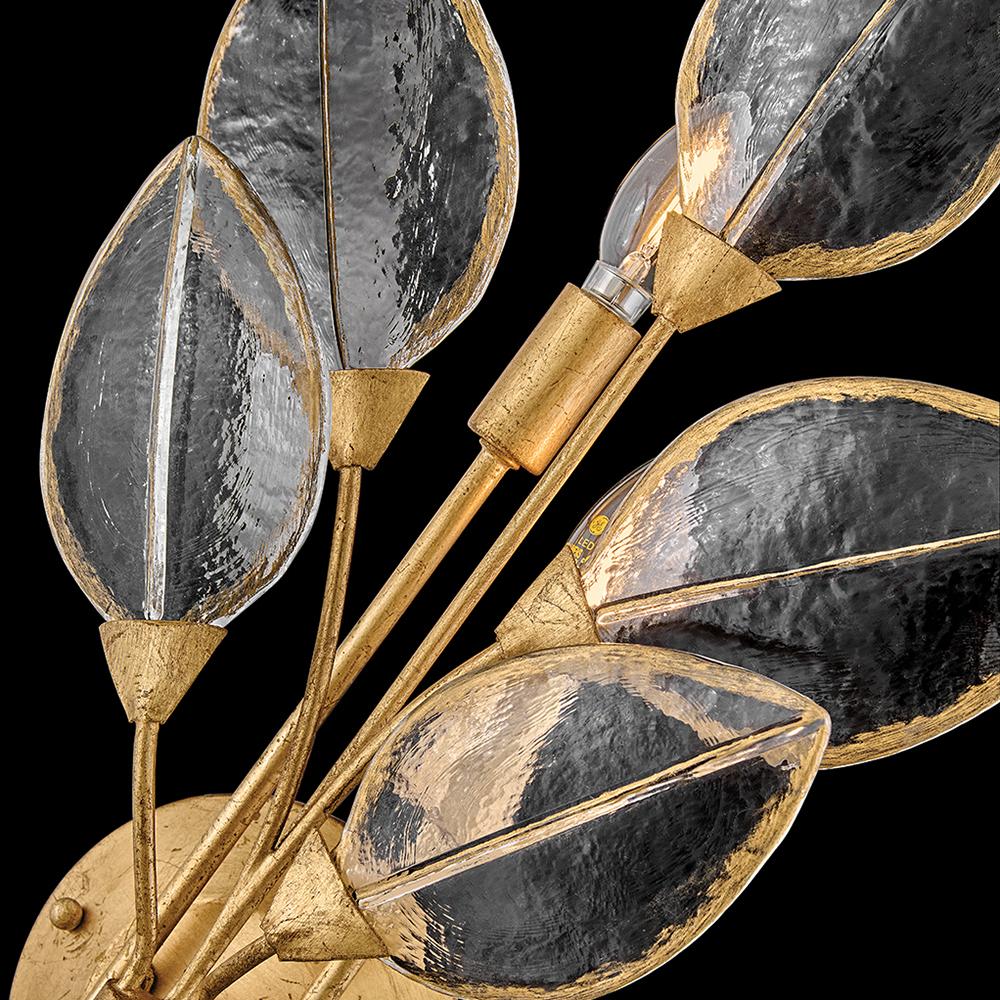 Romantic and elegant, Amira’s floral and vine-inspired design features clear pressed glass leaves hand-painted with delicate gold detailing. A refined Distressed Brass frame evokes a timeless charm.