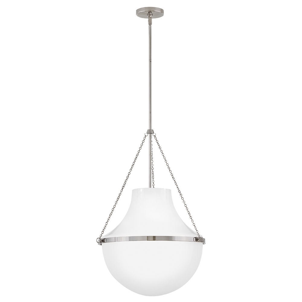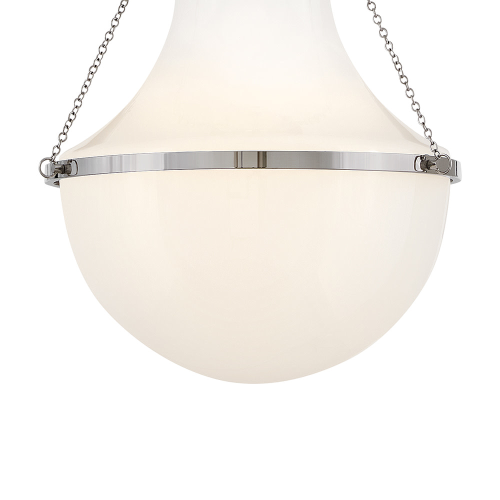 Fusing a sculpted, modern form with classically styled details, Collins features a transitional teardrop shade crafted from blown, cased opal glass. A central metal band and delicate chain uprights are available in Heritage Brass or Black Oxide finishes.