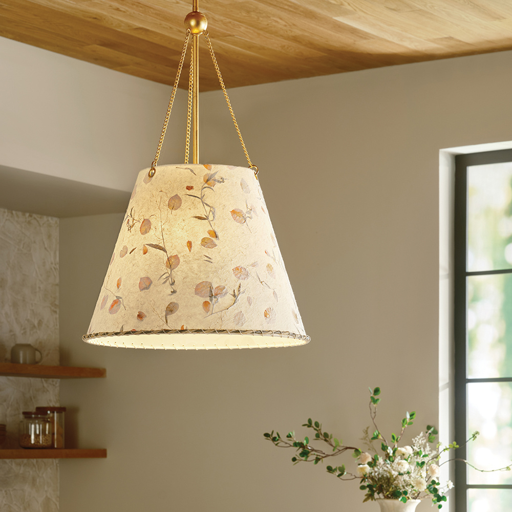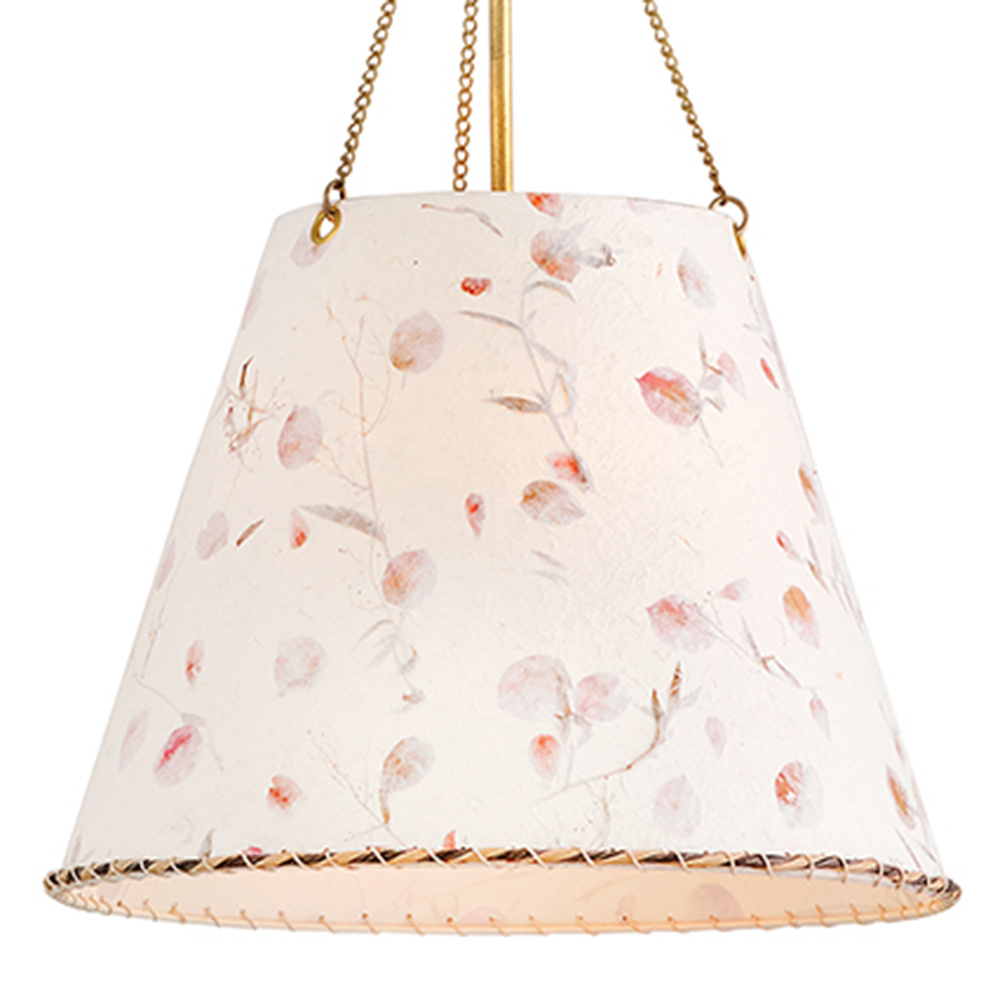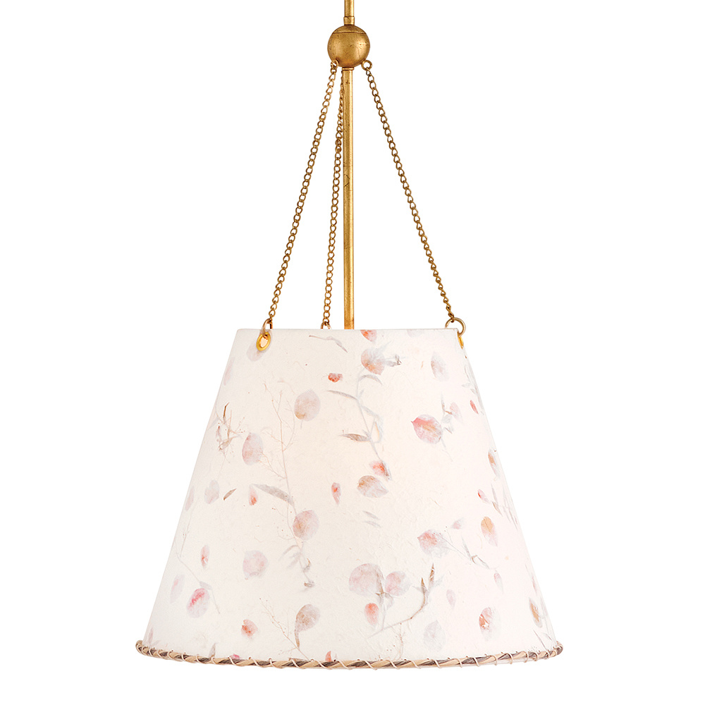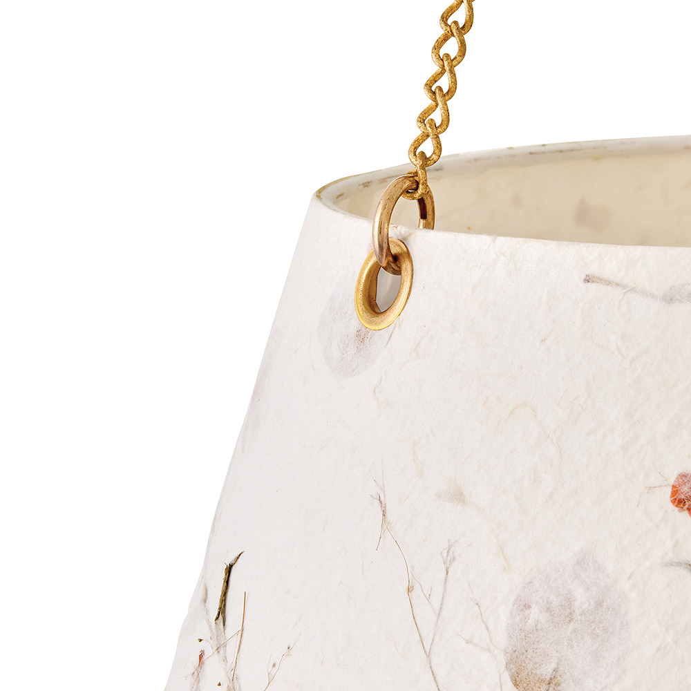 Artisan-crafted from handmade paper pressed with real flowers, Primrose’s delightful shade with twisted rope detailing brings truly unique beauty and cozy ambiance to your space. Its elegant conical silhouette is suspended gracefully from delicate chains, enhanced by a warm Distressed Brass finish.
