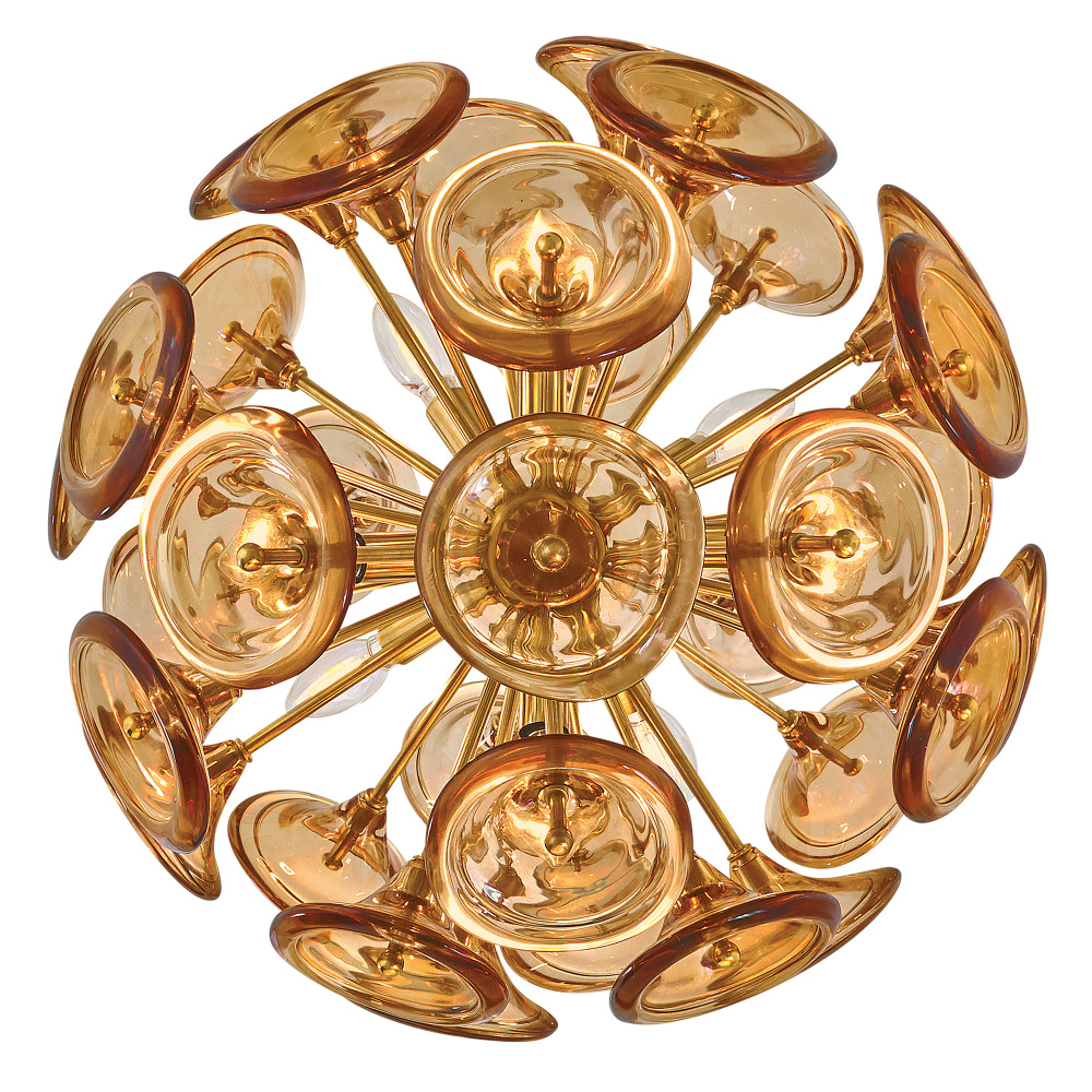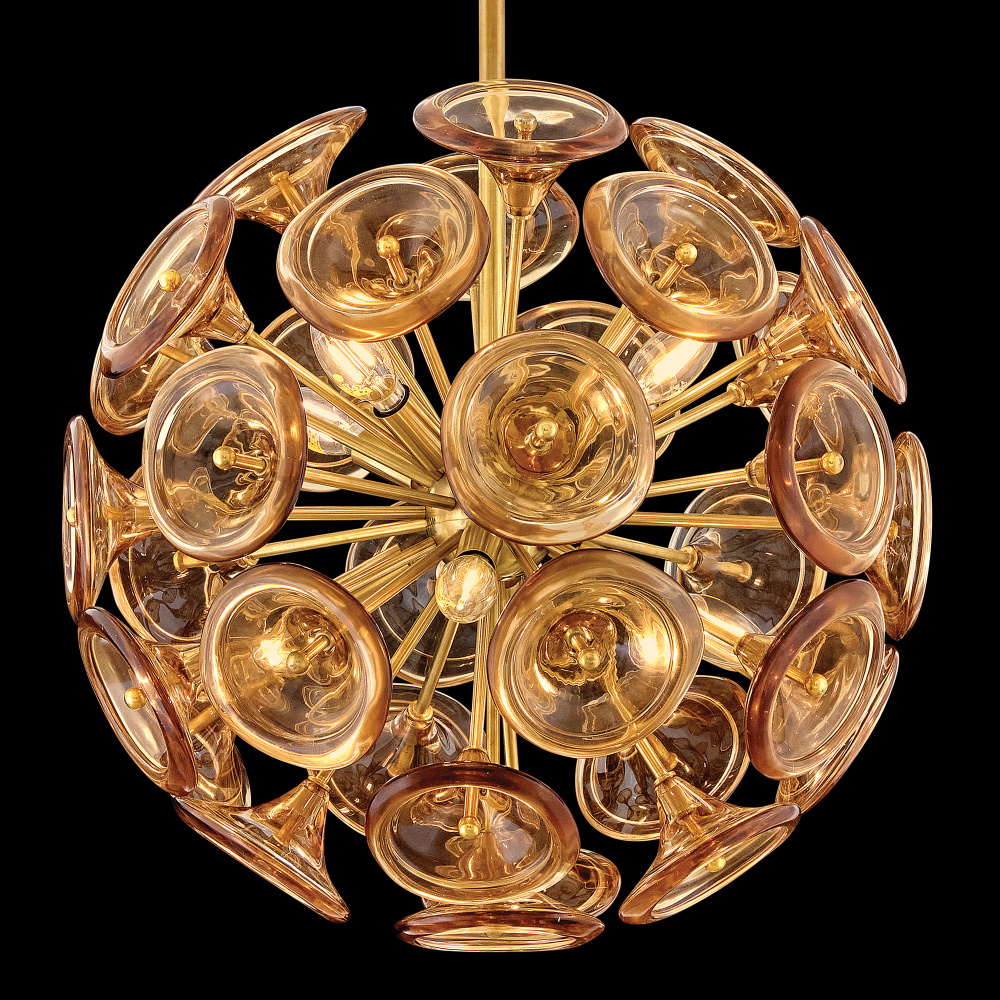 Capturing the essence of natural elegance seen through a contemporary lens, Maya’s hand-blown trumpet blossoms are artfully arranged in radiant bouquets to cast an enchanting aura. Intricate solid brass frames suspended from minimal stems and canopies are hand-painted in a chic Unlacquered Brass finish, adding a classic touch to your decor palette.