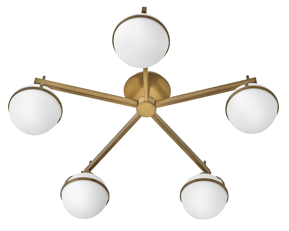 The distinctive vintage globe design of Hollis invokes a mid-century mood, yet its clean lines and sophisticated silhouette provide versatility for a variety of décors. The extra-large semi-flush provides superior lighting for rooms with lower ceilings. Etched opal glass globes shine against a Heritage Brass or a Black finish.