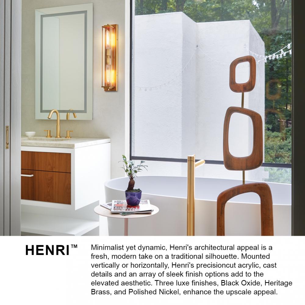 Minimalist yet dynamic, Henri’s architectural appeal is a fresh, modern take on a traditional silhouette. Mounted vertically or horizontally, Henri’s precision-cut acrylic, cast details and an array of sleek finish options add to the elevated aesthetic.