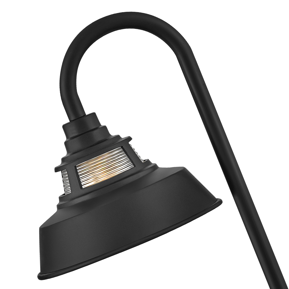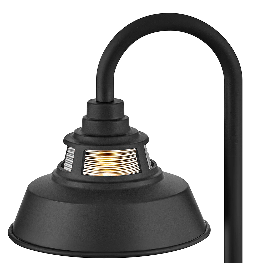 Made of sturdy, solid aluminum, Troyer's warm and inviting heritage details and timeless finishes create a classic outdoor silhouette. Combining farmhouse and industrial, this path light features touches like the trademark gooseneck that suspends the rustic shade and a unique ribbed glass accent at the top for additional light. This low-voltage path light includes a long-lasting LED bulb that will light up walkways and other outdoor living spaces for safety and security. Available in two classic finishes - Black or Oil Rubbed Bronze.