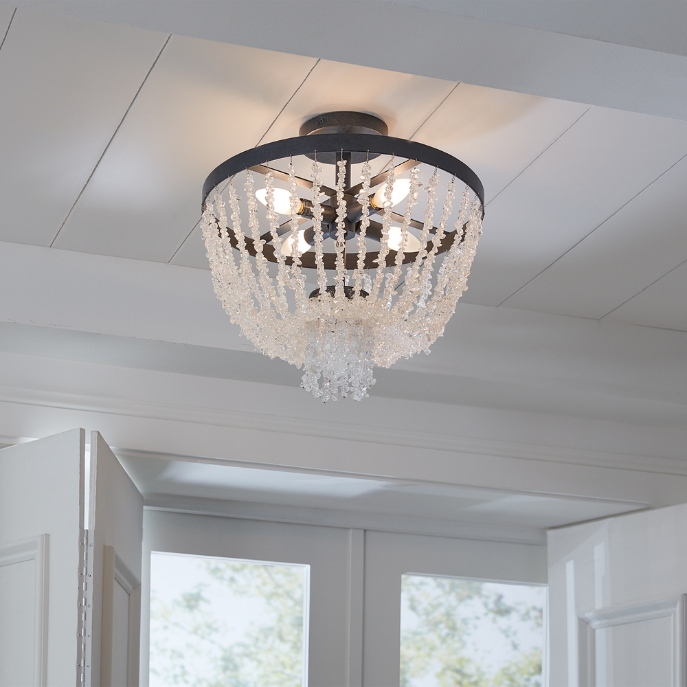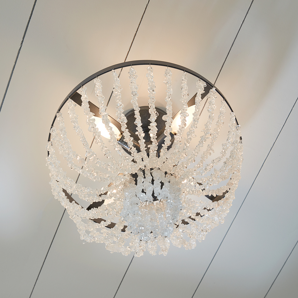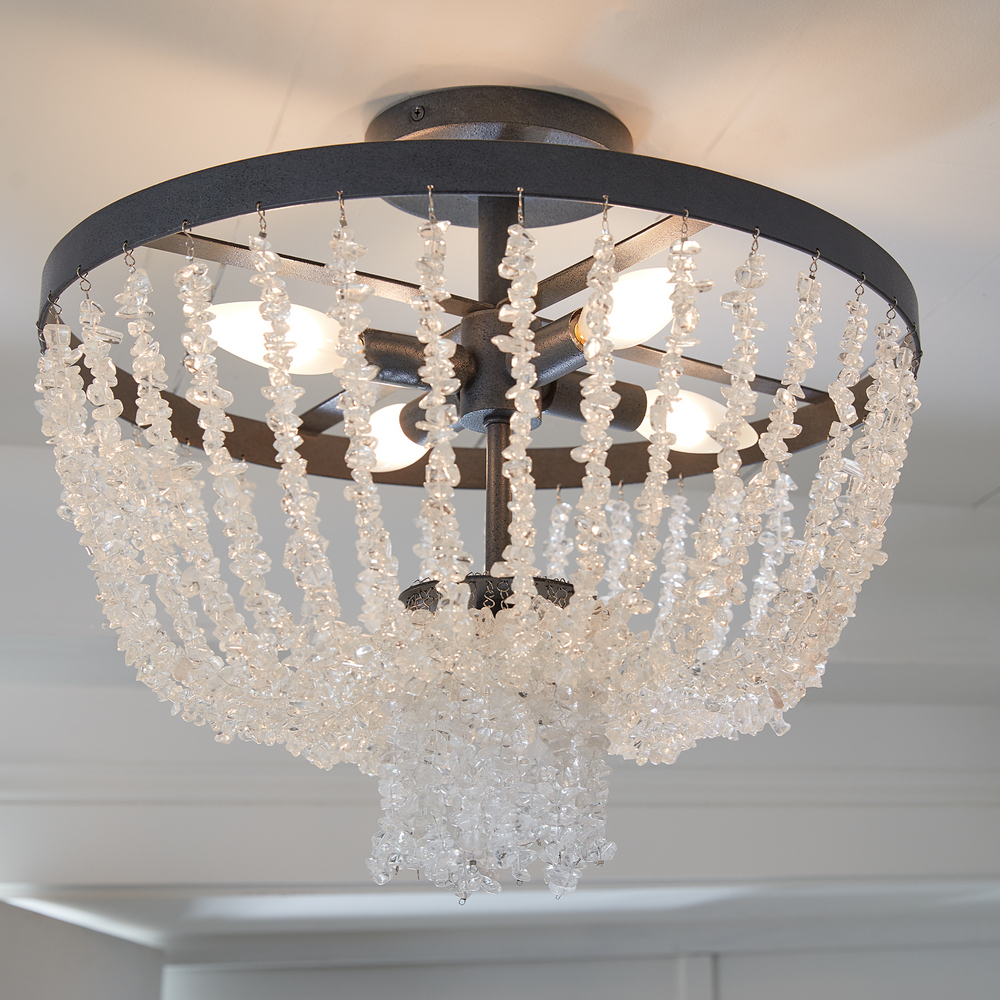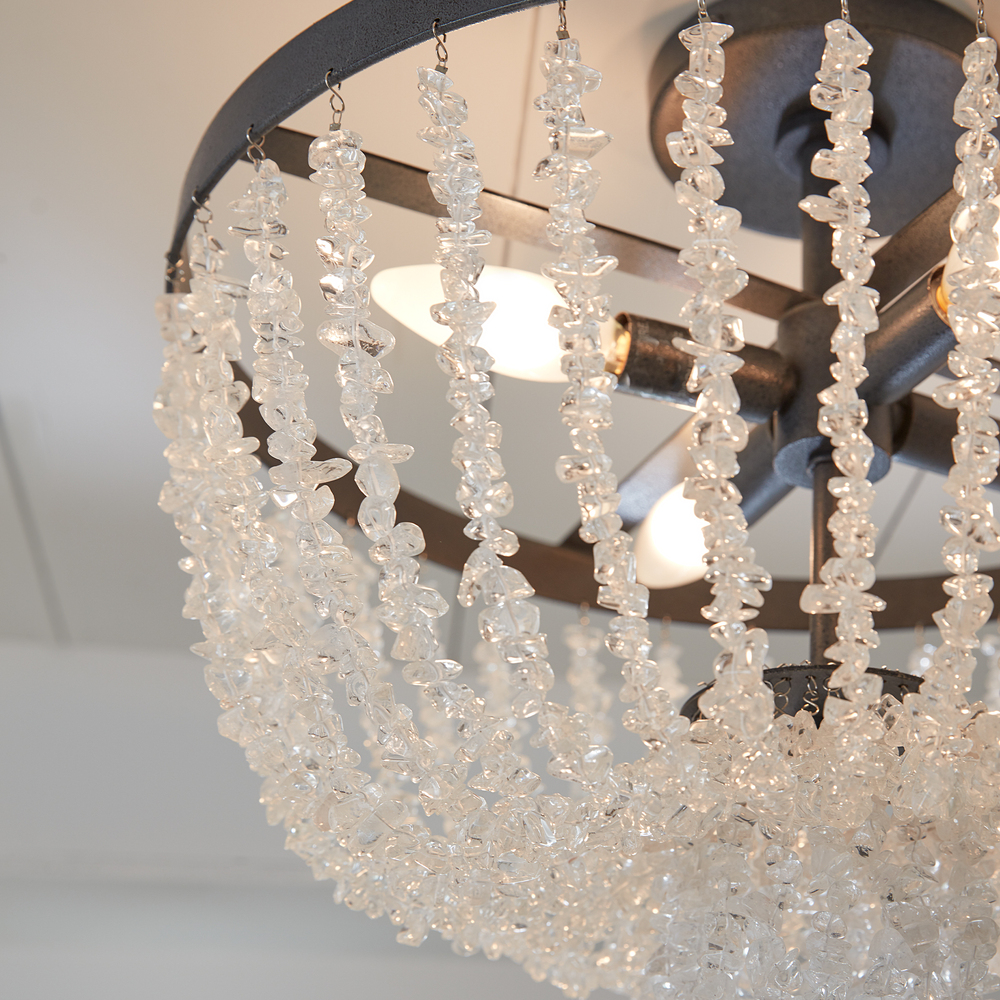 Crafted of steel with Dark Weathered Zinc or Salt Mist finish. Draped crystal beading provides an elegant finishing touch.
