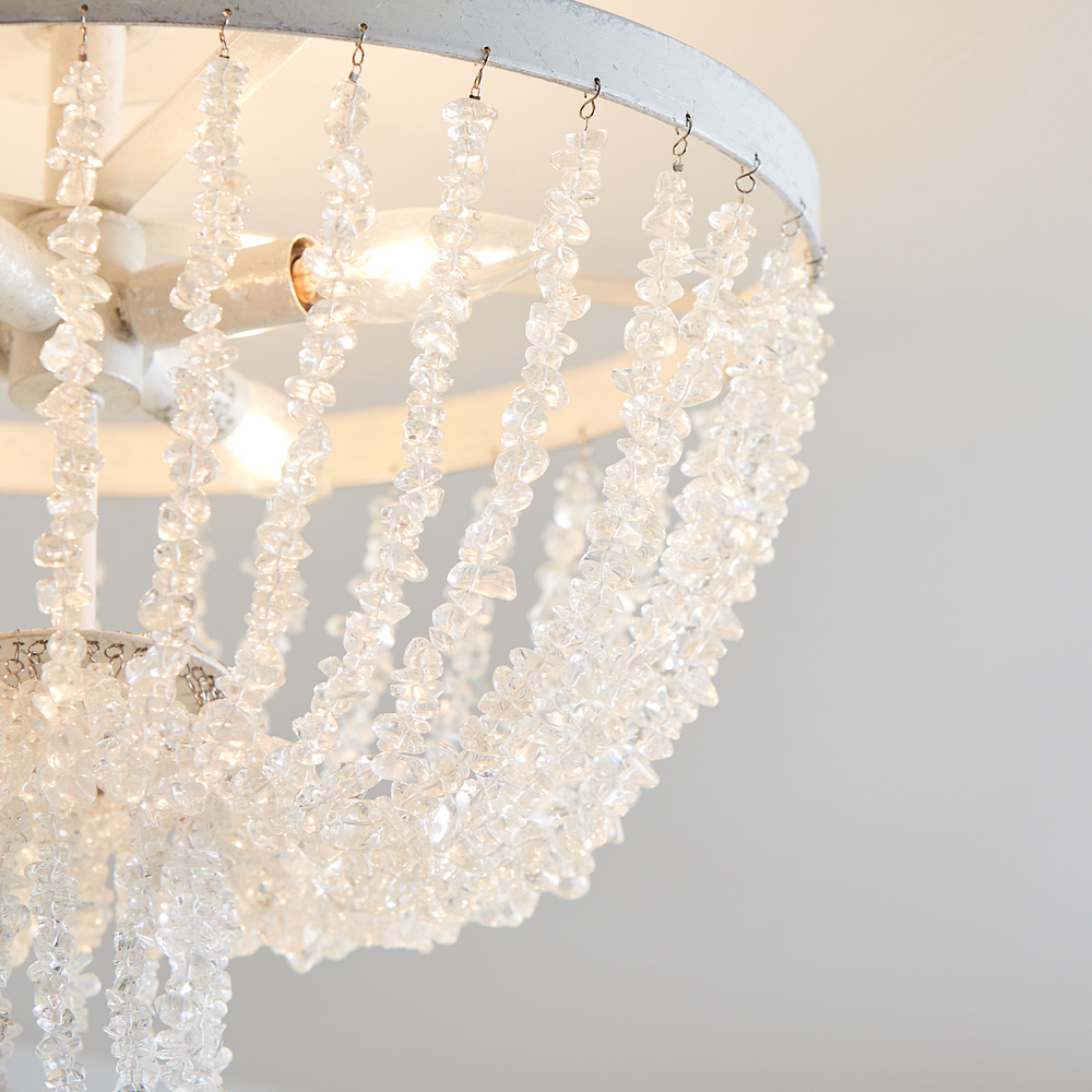 Crafted of steel with Dark Weathered Zinc or Salt Mist finish. Draped crystal beading provides an elegant finishing touch.