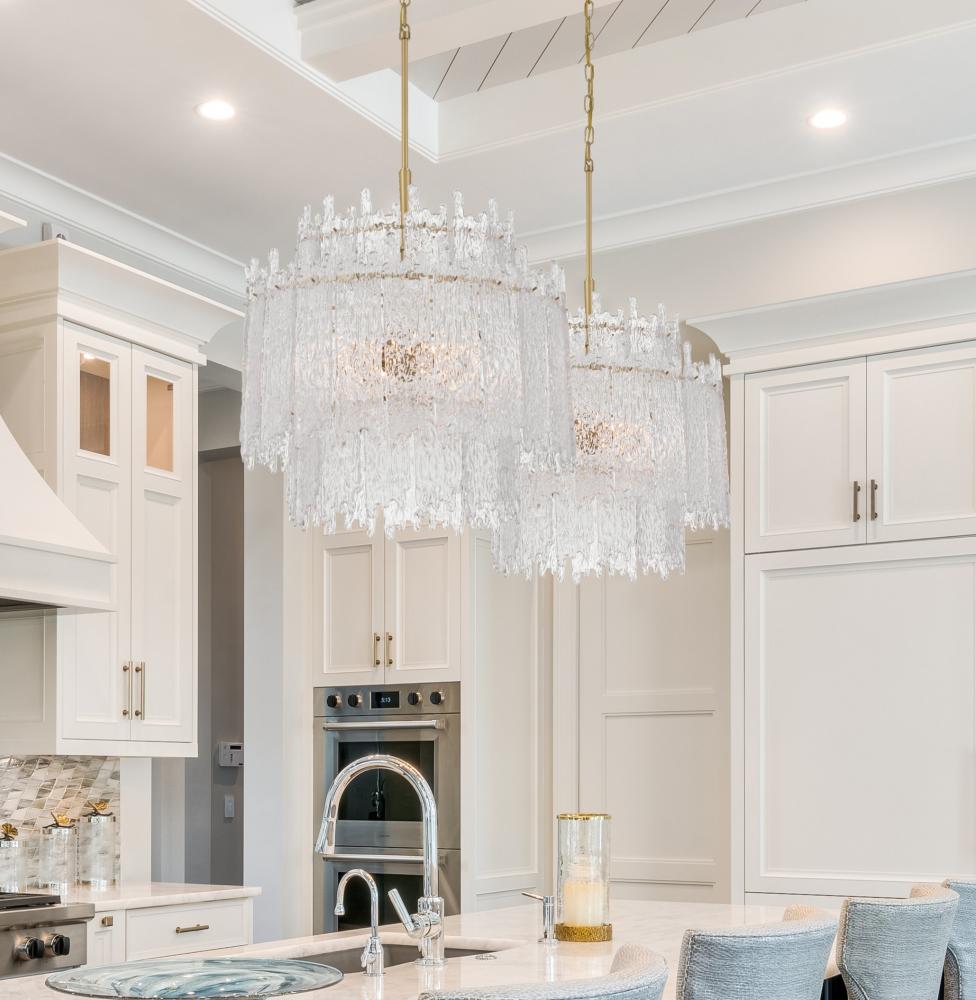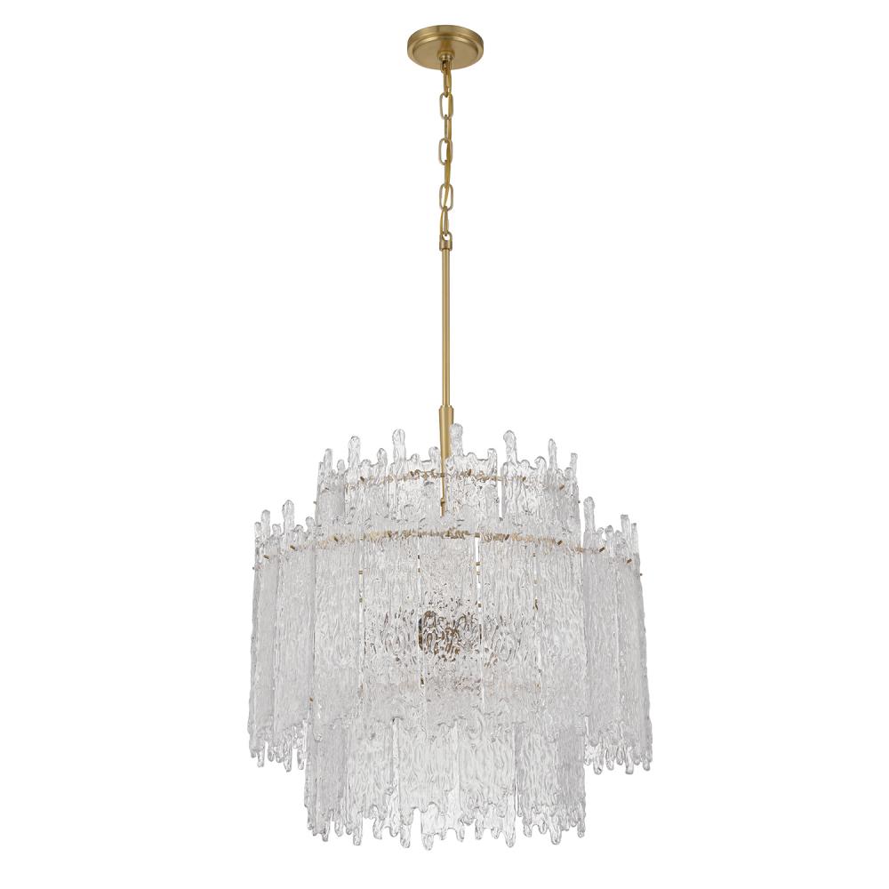 The Ackerly Collection showcases stunning ice glass, a textured material that resembles frozen or cracked ice. Its frosted, crystalline surface uniquely scatters light, producing a soft, diffused glow. This organic, sculptural effect adds a modern yet slightly retro touch to the design. The Ackerly Collection combines elegance with an artistic, edgy aesthetic, making it a standout in any space.
