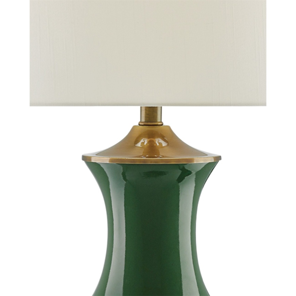 Serenity has a profile in the green version of our Lilou Table Lamp with its lovely vase-like profile. Made of green ceramic with metal hardware that has been treated to an antique brass finish, the lamp stands 32 inches high and is topped with an eggshell shantung drum shade. About as classic as they come, the Lilou is also available in a winsome white.