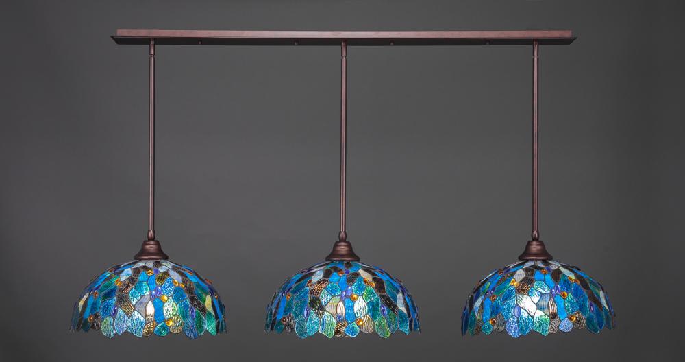 Toltec Lighting 48-BRZ-995 3 Light Stem Hung Linear Pendalier With Hang Straight Swivel Shown In Bronze Finish With 16 Blue Mosaic Art Glass