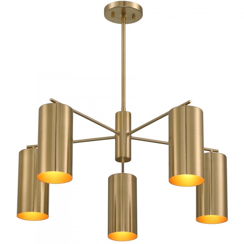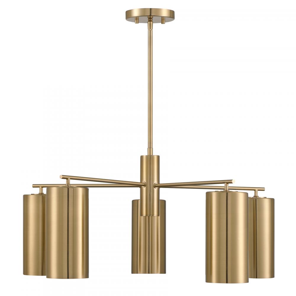 The Savoy House Lio 5-light chandelier is part of Moderne by Breegan Jane, bringing her signature approachable modern luxury style to your home. Breegan loves the timeless, elevating beauty of brass, as seen in this sleek and chic design. Bold solid metal cylinders finished in champagne-toned Noble Brass hold lights that shine out above and below to create a concentrated and dramatic lighting look. Lio is 28" in width and has an adjustable height ranging from 13" to 67". Comes with four 12" downrods and one 6" downrod. Uses five standard size bulbs of up to 60 watts per bulb. Bulbs not included.