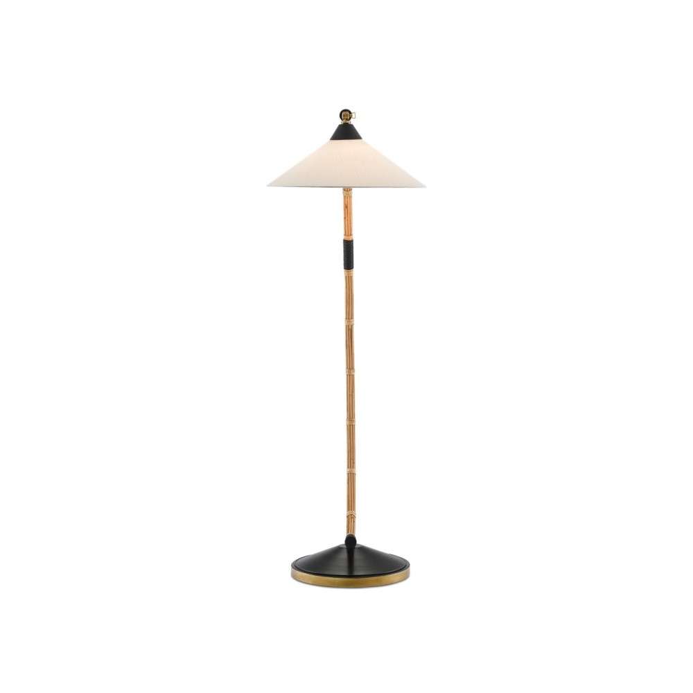 A nod to one of the world's seafaring port cities, our Lisbon Floor Lamp, which is made of wrought iron in new brass and satin black finishes, has a stem covered in rattan to bring a nautical feel to its character. Several design notes worth mentioning on this rattan floor lamp are the curvature of the stem that has several sections wrapped horizontally in black, the shape of and details on the off-white linen shade, and the black finish at the top of the base.