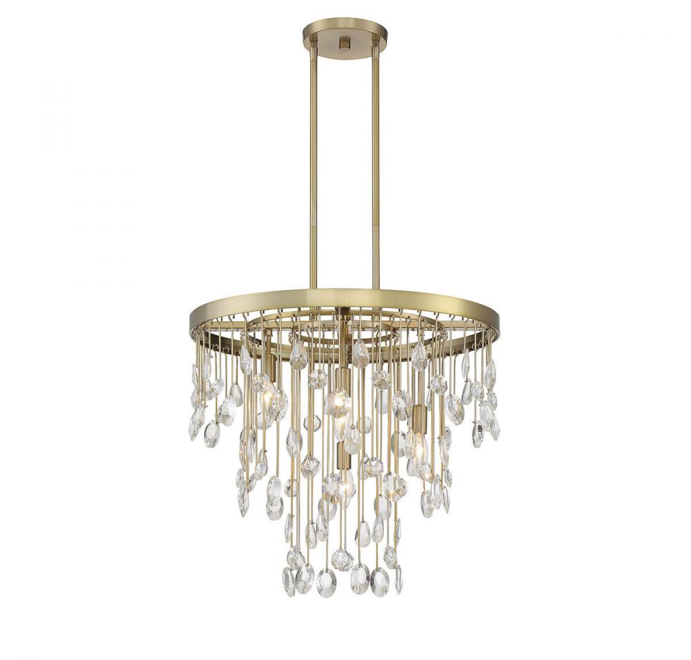 If you are looking for lighting that makes a big style statement, look no further than this Savoy House Livorno 4-light pendant. Every aspect of Livorno is thoughtfully designed to create the biggest impact, from the lights that hang at different heights to the 3 tiers of beautifully faceted crystals in different shapes and sizes. This is the perfect way to indulge your craving for updated Hollywood Regency glamour in any room, including foyers, living rooms, kitchens and bedrooms. Finished in Noble Brass. This fixture is 21" wide and has an adjustable height that ranges from 25" to 71". Uses 4 candelabra size bulbs of up to 60 watts each (not included).