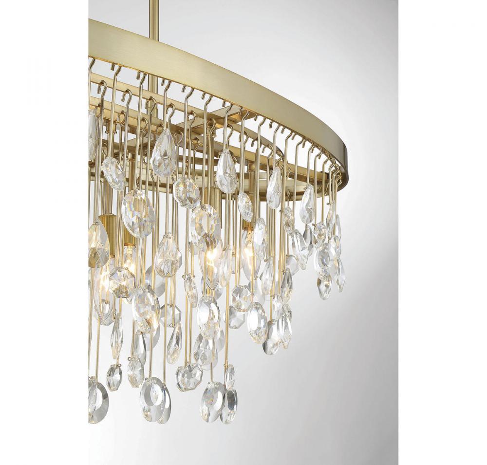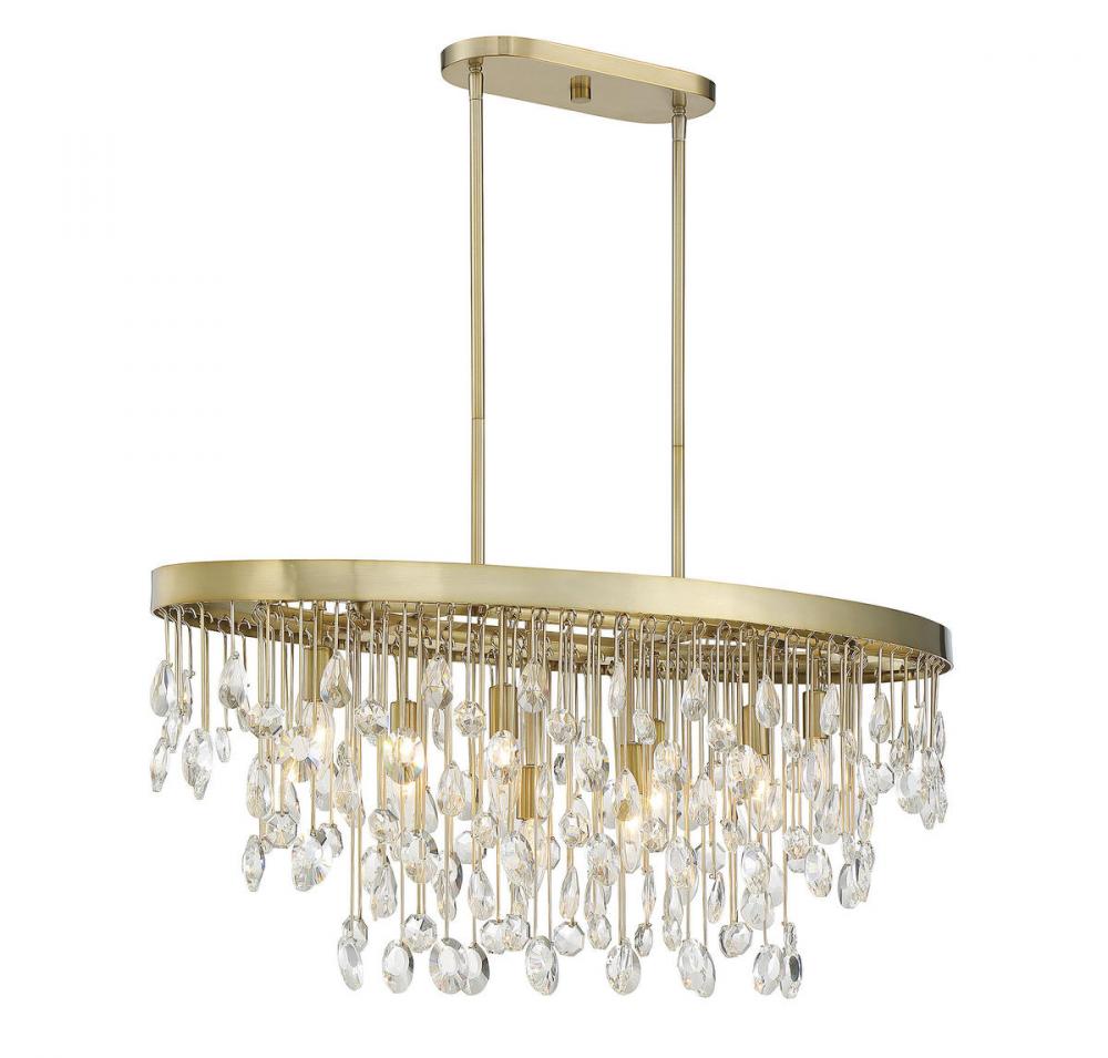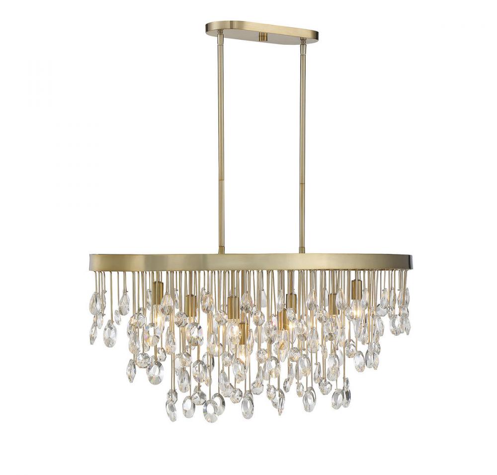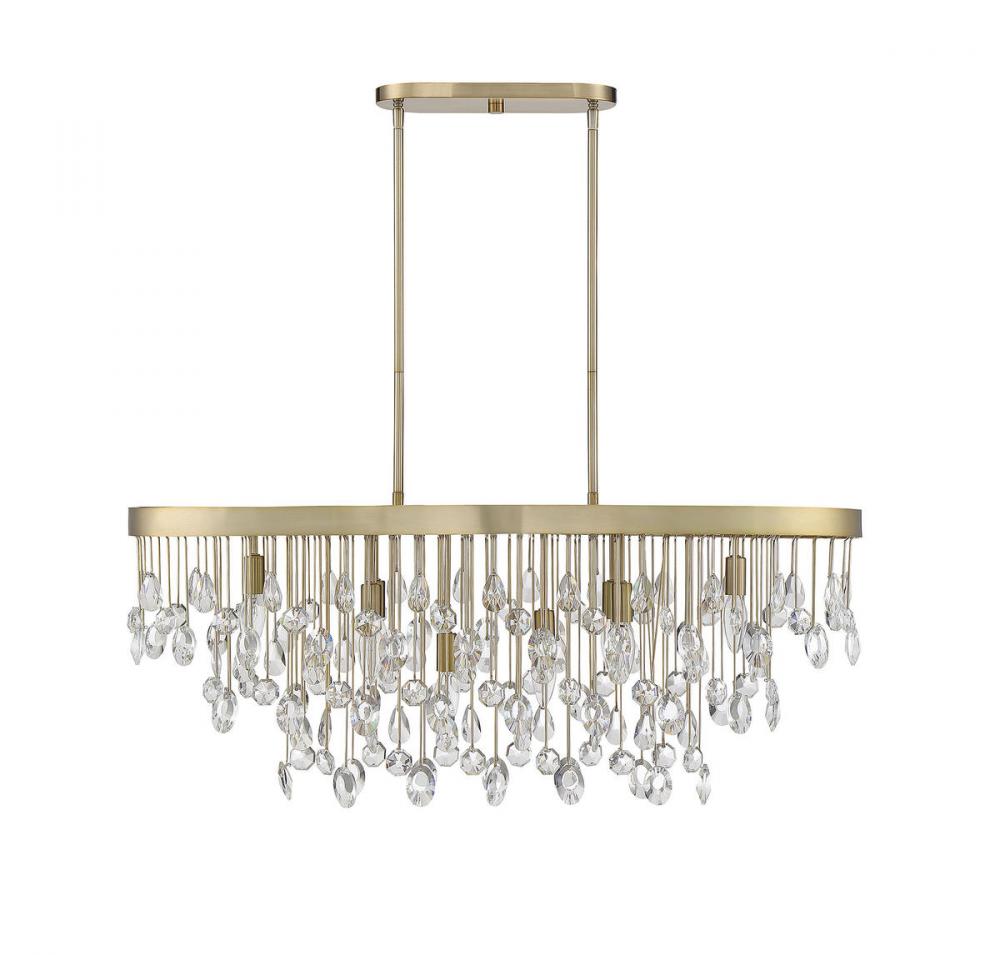 If you are looking for lighting that makes a big style statement, look no further than this Savoy House Livorno 8-light linear pendant. Every aspect of Livorno is thoughtfully designed to create the biggest impact, from the lights that hang at different heights to the 3 tiers of beautifully faceted crystals in different shapes and sizes. This is the perfect way to indulge your craving for updated Hollywood Regency glamour in any room, including foyers, living rooms, kitchens and bedrooms. Finished in Noble Brass. This fixture is 15" wide, 36" long and has an adjustable height that ranges from 21" to 67". Uses 8 candelabra size bulbs of up to 60 watts each (not included).
