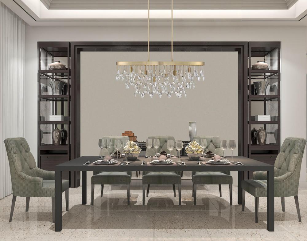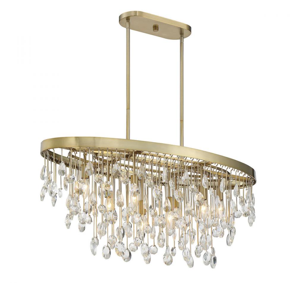 If you are looking for lighting that makes a big style statement, look no further than this Savoy House Livorno 8-light linear pendant. Every aspect of Livorno is thoughtfully designed to create the biggest impact, from the lights that hang at different heights to the 3 tiers of beautifully faceted crystals in different shapes and sizes. This is the perfect way to indulge your craving for updated Hollywood Regency glamour in any room, including foyers, living rooms, kitchens and bedrooms. Finished in Noble Brass. This fixture is 15" wide, 36" long and has an adjustable height that ranges from 15" to 72". Uses 8 candelabra size bulbs of up to 60 watts each (not included).