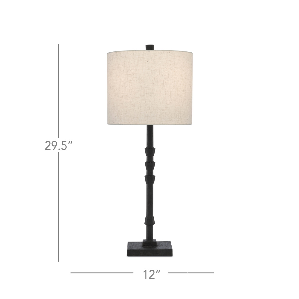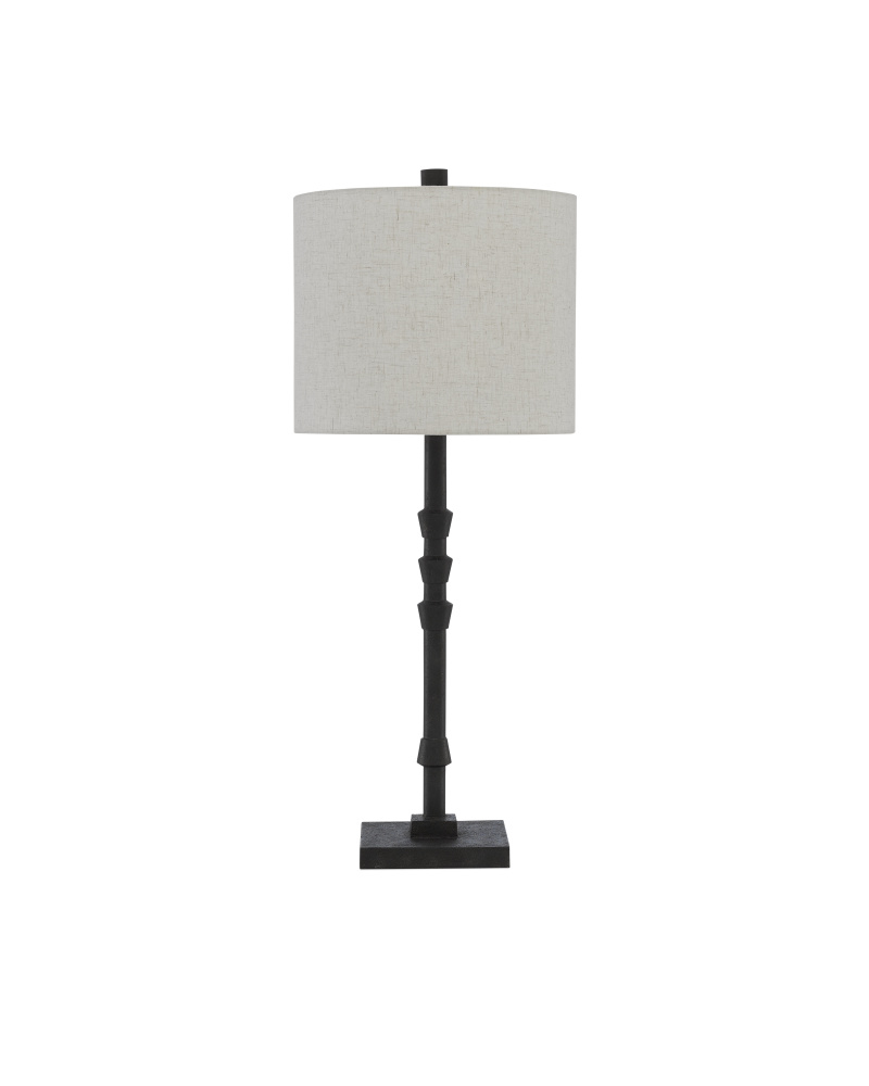 The mark of a talented designer is shown in the makeup of our Lohn Table Lamp. The ornamentations on the thin stem have a balance to them that pleases the eye—three upturned fluted motifs pointing toward the shade and one pointing toward the simple stacked base. Topping the cast-iron piece off, above the beige poplin shade, is a finial that has the same tonal qualities as the body of the lamp, which reads as black but has the subtlest of hints of dark brown texture to it.