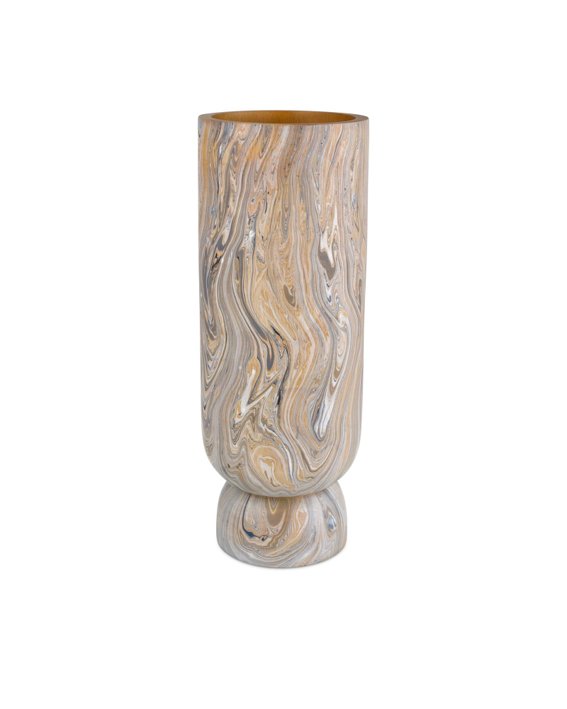 Made of wood, the London Sky Vase Set includes three gray and peach vases with swirling patterns along their surfaces, which have been hand-painted for a marbleized effect. The neutral tones of tan, peach, white, and gray bring these tan decorative accessories a textural feel. The patterning on these multicolored vases will make them dynamic elements in a room.