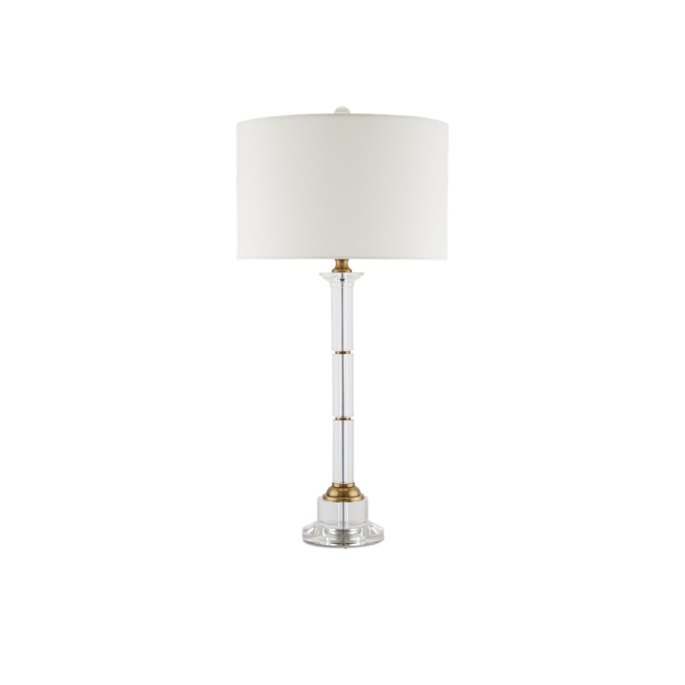The Lothian Table Lamp is a classically shaped design made of clear optic crystal and metal in an antique brass finish. The way the column culminates with an abacus and echinus, and the fact the base reads like a stylobate, the lamp mimics a refined element in architecture. The drum shade is fastened to the lamp with an optic crystal finial.