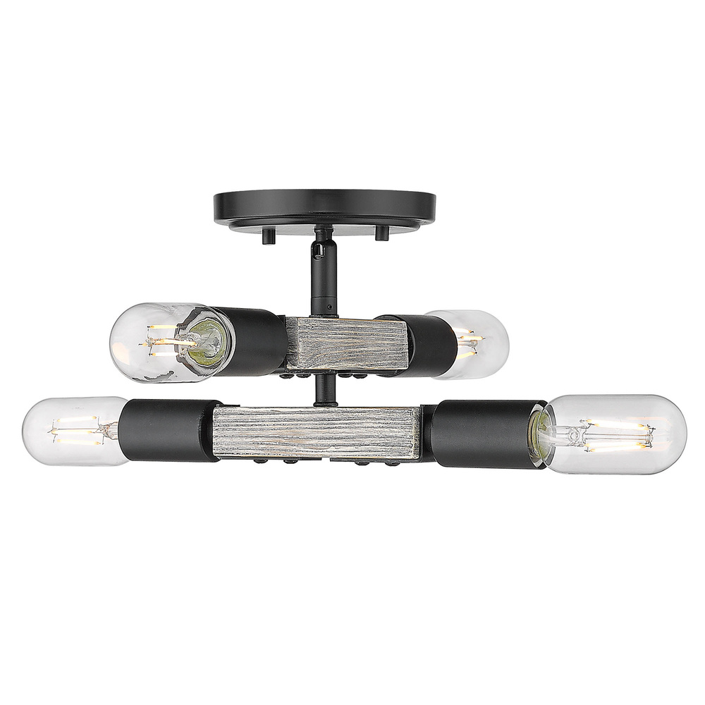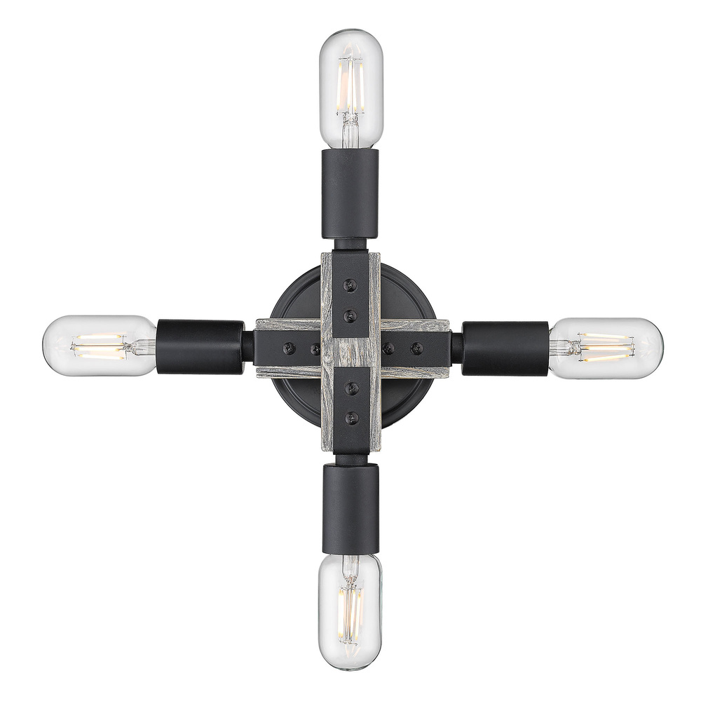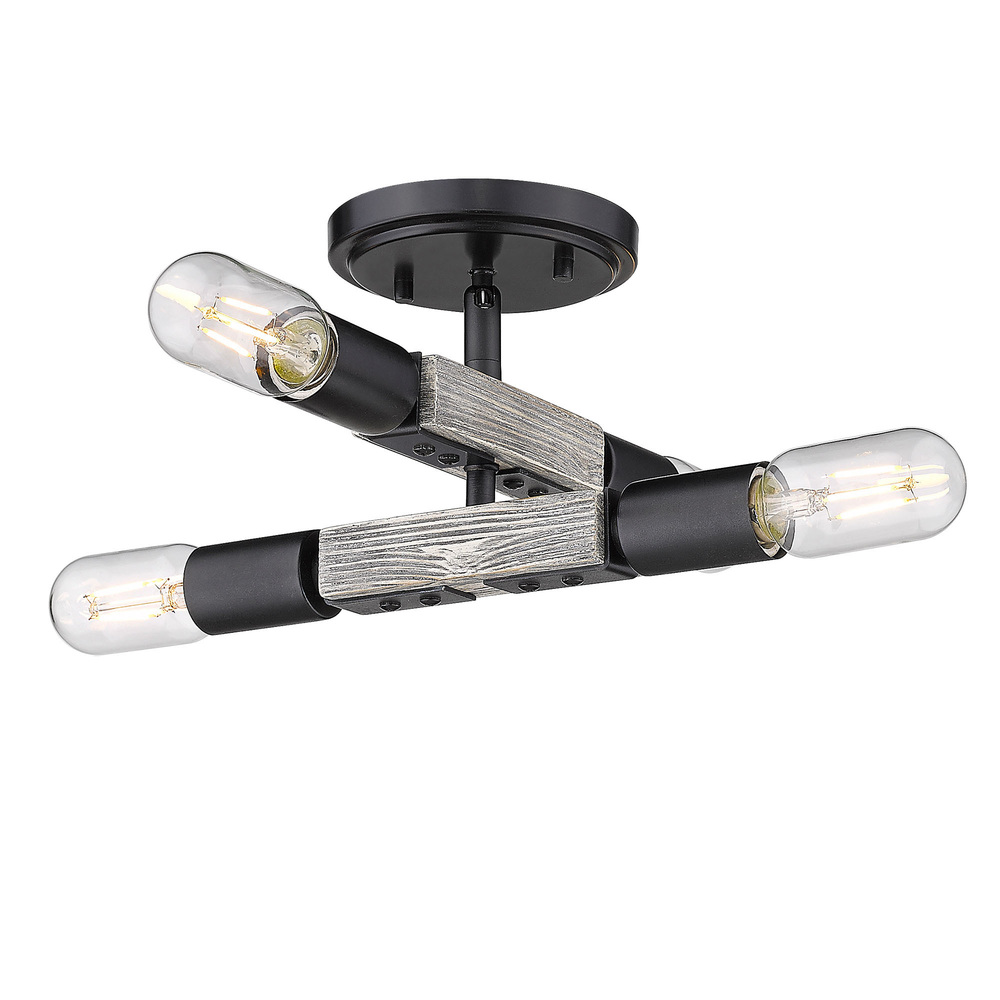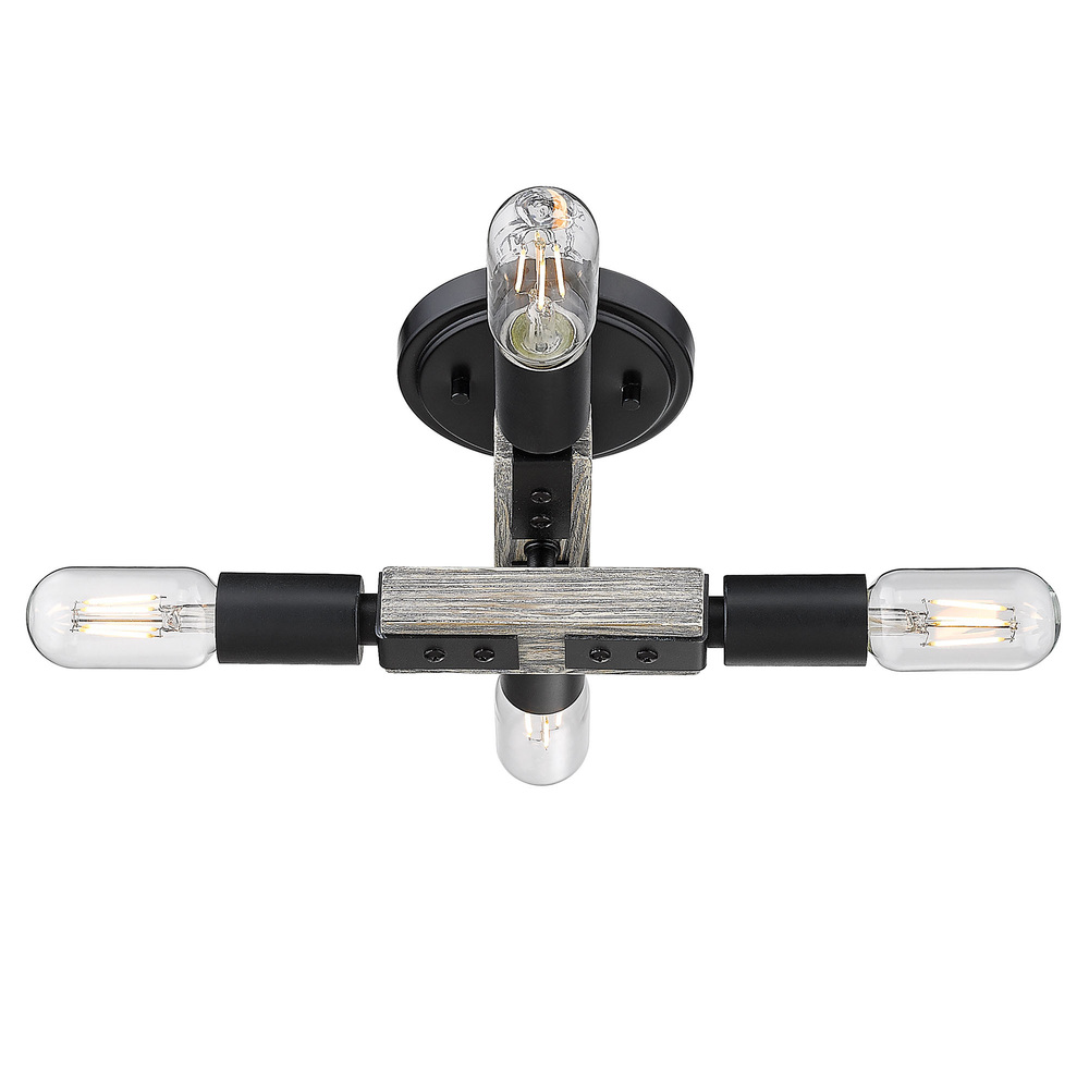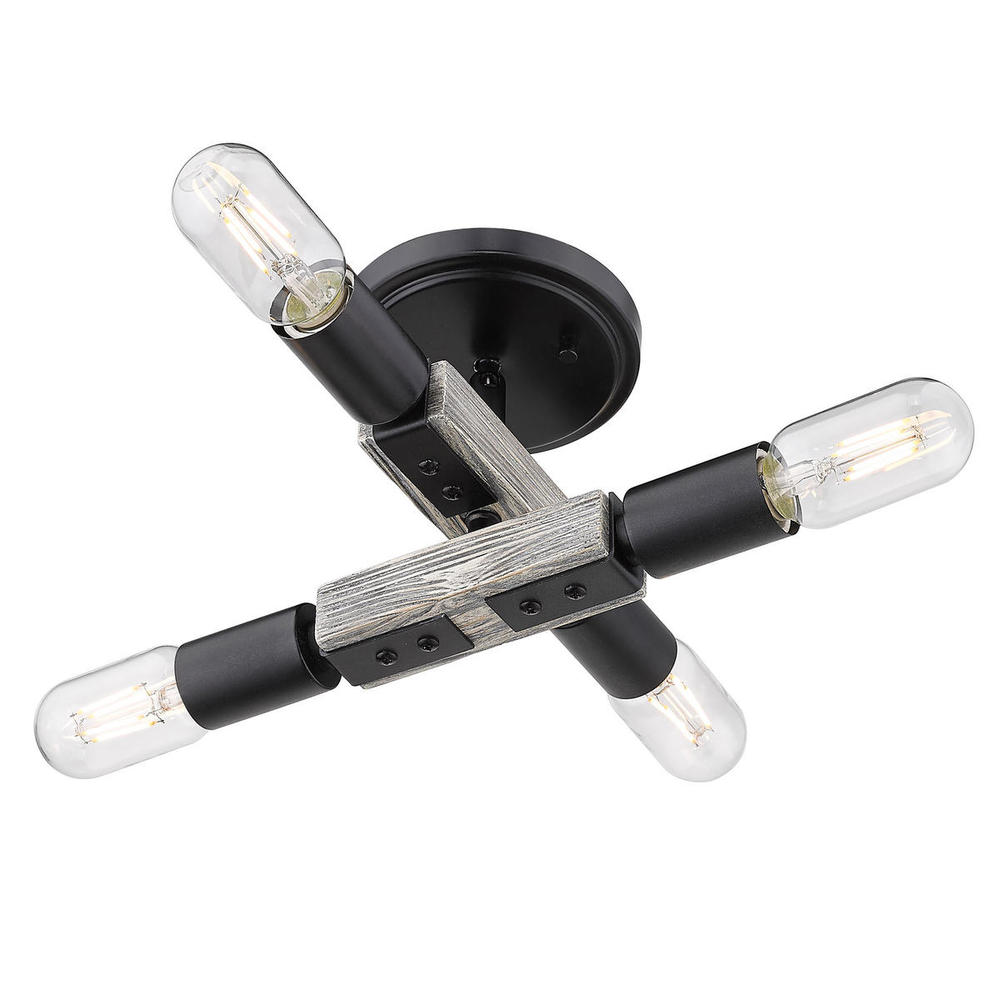 Simple and geometric, Lowell is rustic style in a modern form. Crafted of genuine Pinewood, the lightly distressed solid wood frames are washed in a soft gray for a casual, coastal feel. The dark matte black of the exposed sockets, joints, and hardware lends an industrial influence to the design, providing dramatic contrast to the light tone of the natural wood. This flush mount fixture creates a generous open area for widespread ambient lighting. It can be used individually or arrayed as a set.