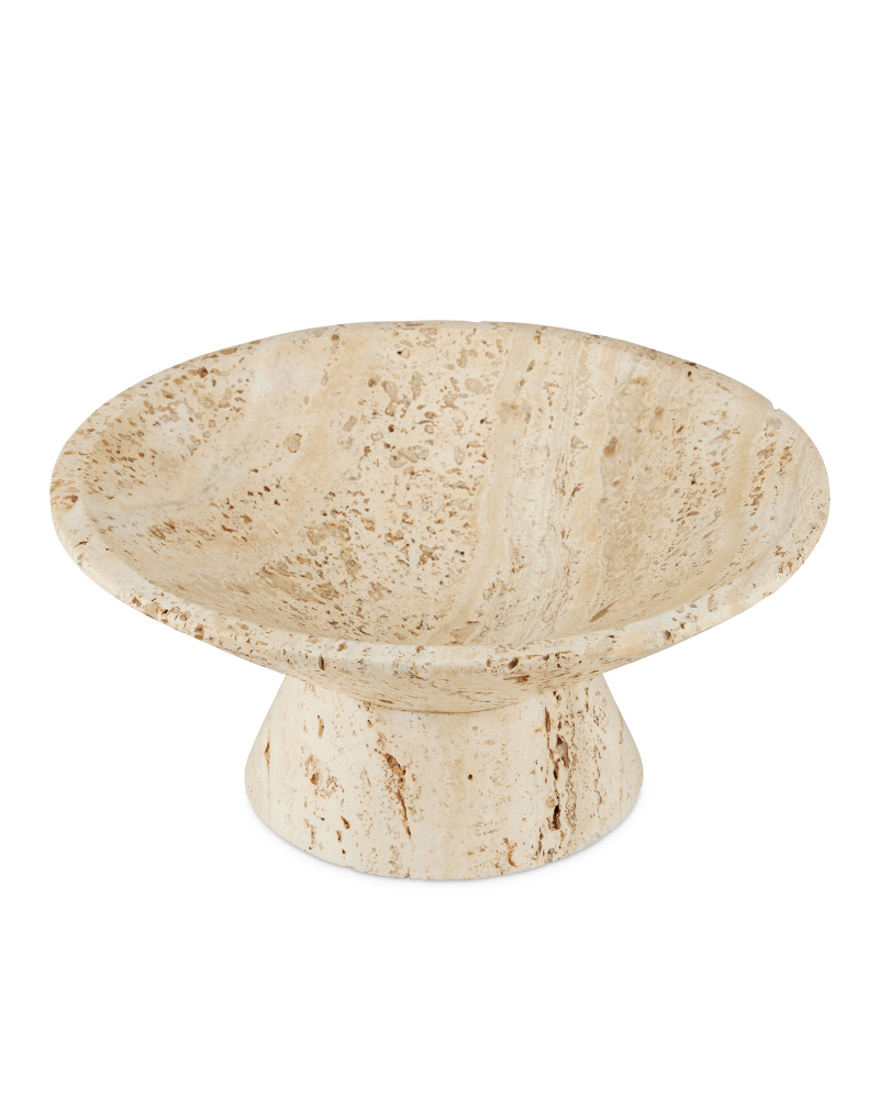 The Lubo Travertine Small Bowl is made of Travertine, which has a swirling personality as fluid as the shifting sands of the desert. The tan footed bowl will be a chameleon in an interior, as it will be just as fitting for holding decorative objects in a main living space as it will be for displaying brightly-colored ornaments during the holidays. The surfaces will vary from piece to piece.