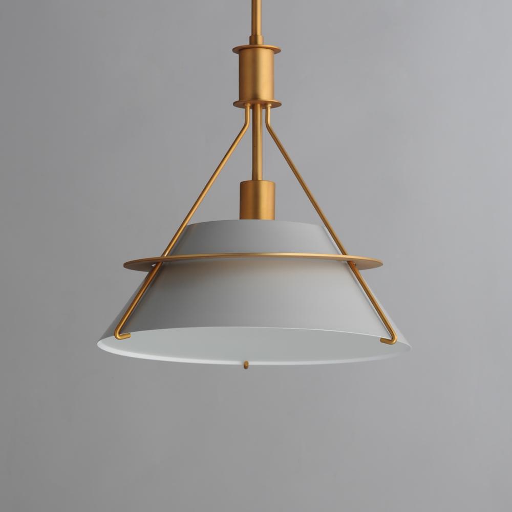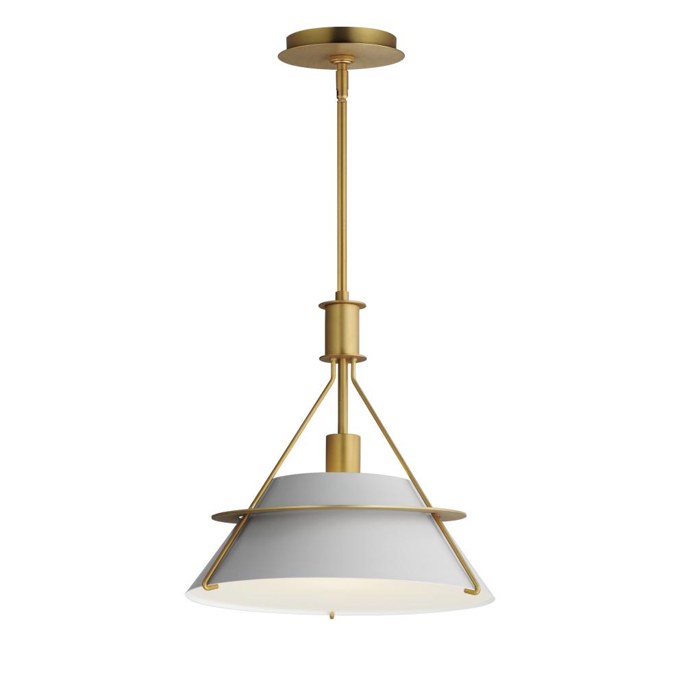 Metal shades of Light French Gray, Black or Matte White are suspended from halos of contrasting Natural Aged Brass finish. Maximizing the light output, the interior of the shades are painted white, and their tops are left open casting light both upwards an