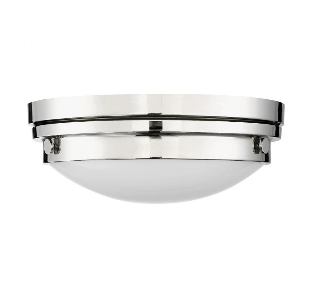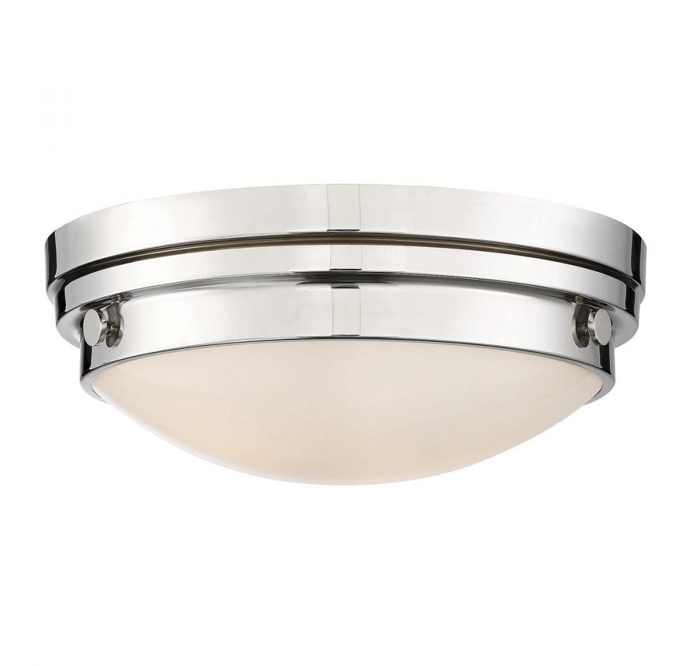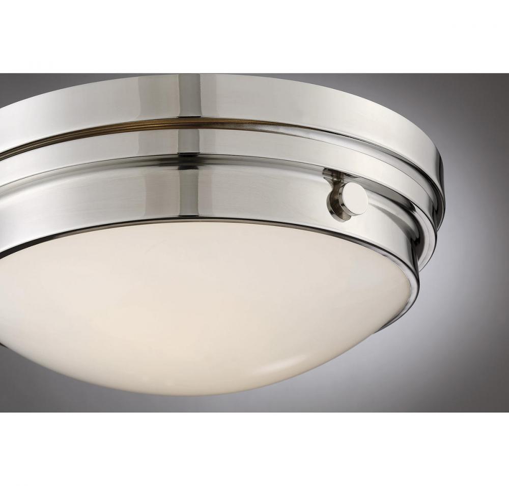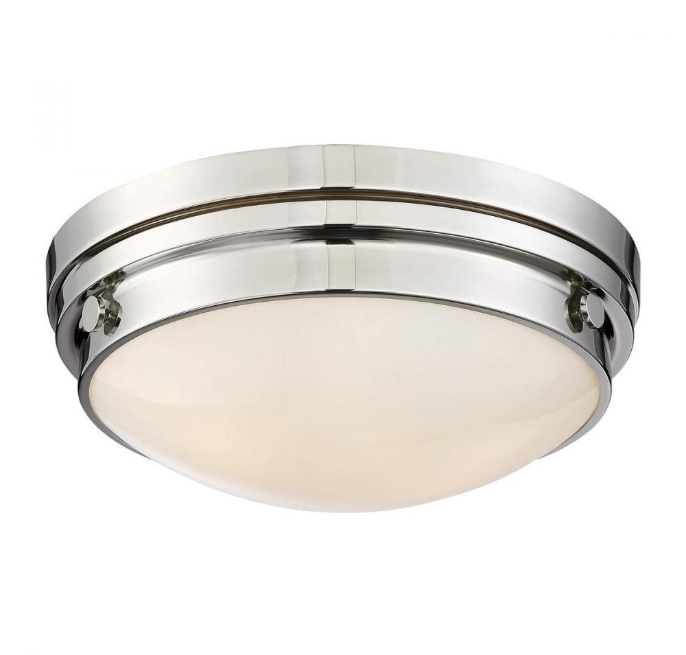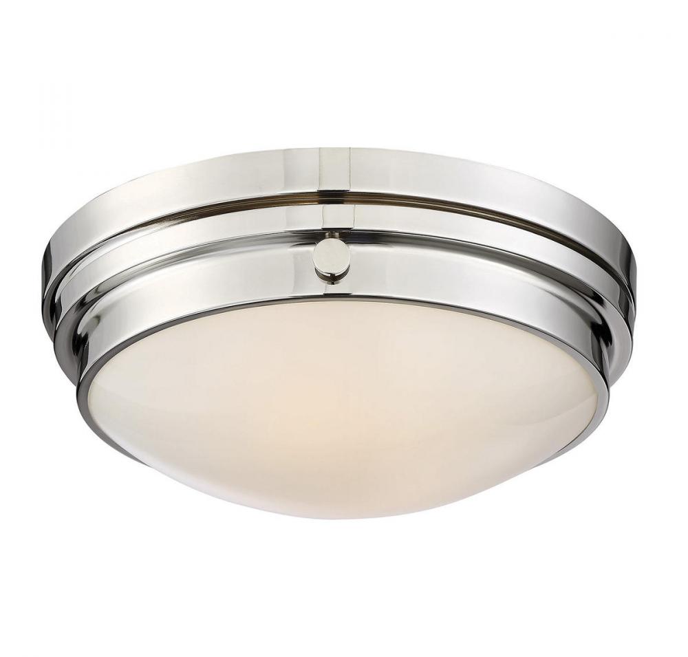 The Savoy House Lucerne 2-light ceiling flush mount is sure to bring sleek metallic style to any space! A white glass shade makes Lucerne an ideal choice for comfortable, useful light. Finished in sleek polished nickel. Flush mounts can be used on the ceiling of pretty much any interior room, including foyers, hallways, stairways, closets, bathrooms, bedrooms, kitchens and more! Bulbs not included. The polished nickel finish can be paired with nickel hardware or mixed with hardware in other finishes. Pep up the light and style of any room with Lucerne. When you choose a Savoy House lighting fixture, you can be certain you've selected a piece that will withstand the test of time.