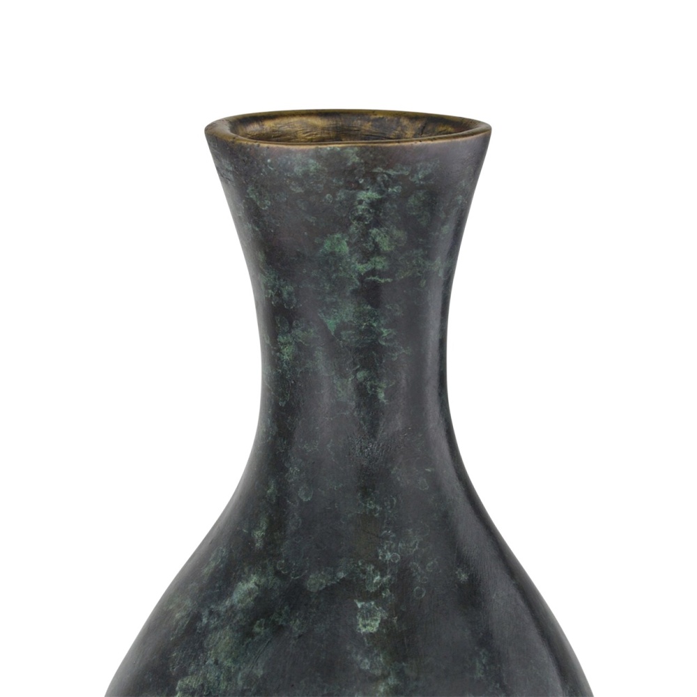 The Luganzo Medium Bronze Vase has the undulant character of turned wood, but the sculpture is made of bronze with a jade green patina. A polished gold ring defines the culmination of its neck for a hint of sheen. The incredible distressing the artisans achieved with this vase after it has emerged during a lost-wax technique makes it a stunning textural piece that will read like an antique.