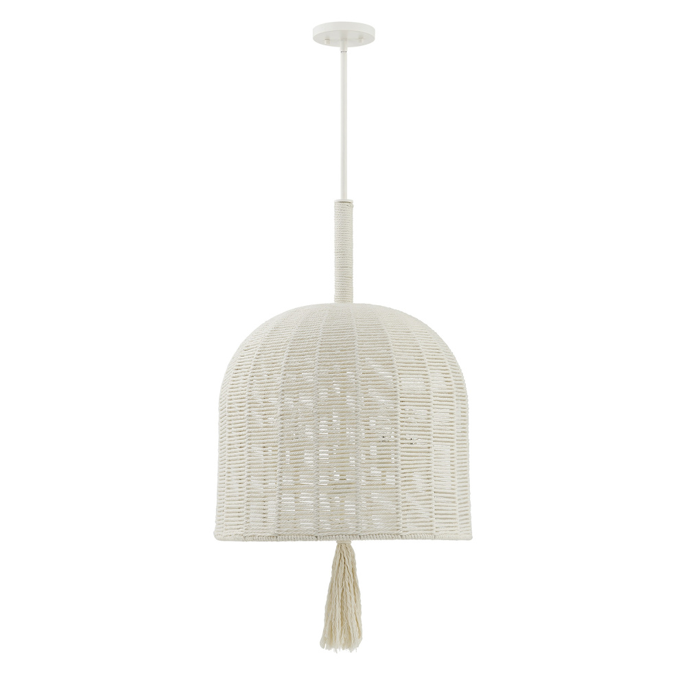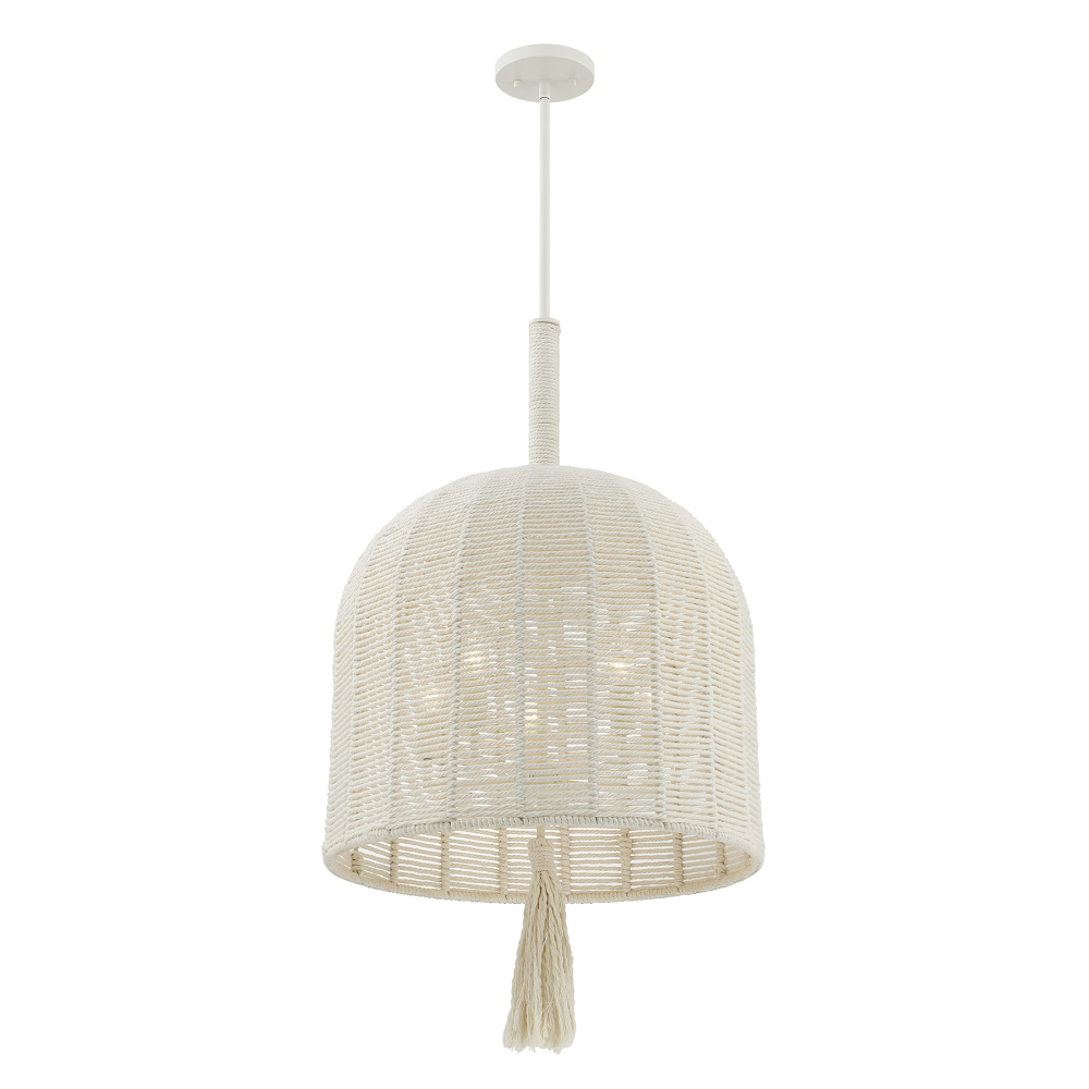 The Savoy House Lunara 5-light pendant was designed by award-winning interior designer and TV host Breegan Jane. With its woven shade and tassel crafted from cotton rope, it brings a breezy, unhurried spirit inspired by California living. The Painted White Alabaster finish is a flawless match for the cotton rope. Lunara is 20" in width and has an adjustable height ranging from 33" to 87". It uses five candelabra size bulbs of up to 60 watts per bulb. Bulbs not included. Comes with four 12" downrods and one 6" downrod.