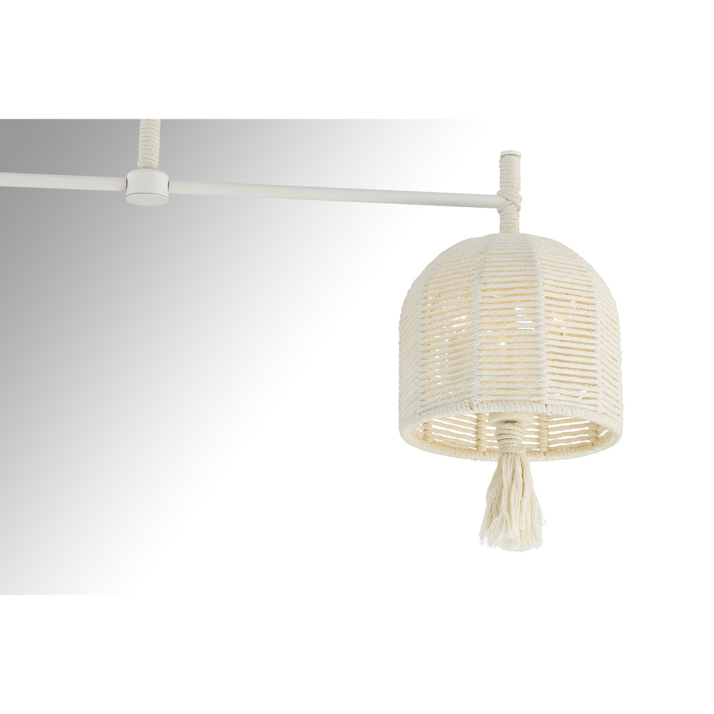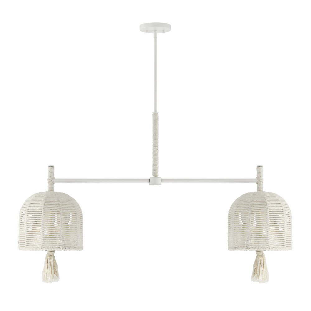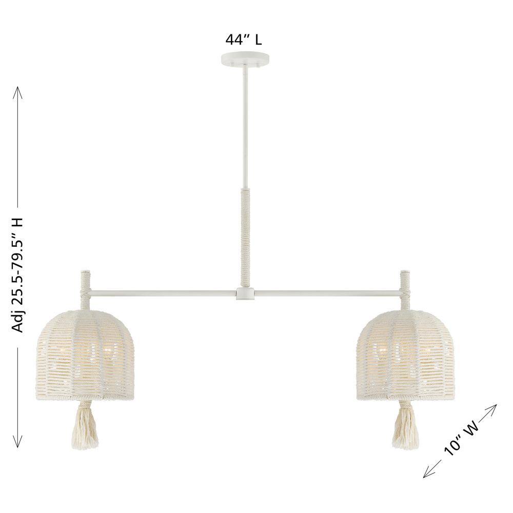 The Savoy House Lunara 6-light linear chandelier was designed by award-winning interior designer and TV host Breegan Jane. With its woven shades and tassels crafted from cotton rope, it brings a sun-washed sense of calm inspired by Breegan's California roots. The Painted White Alabaster finish is a flawless match for the cotton rope. Lunara is 44" in length, 10" in width and has an adjustable height ranging from 25.5" to 79.5". It uses six candelabra size bulbs of up to 60 watts per bulb. Bulbs not included. Comes with four 12" downrods and one 6" downrod.
