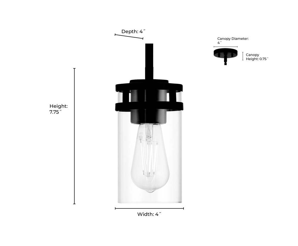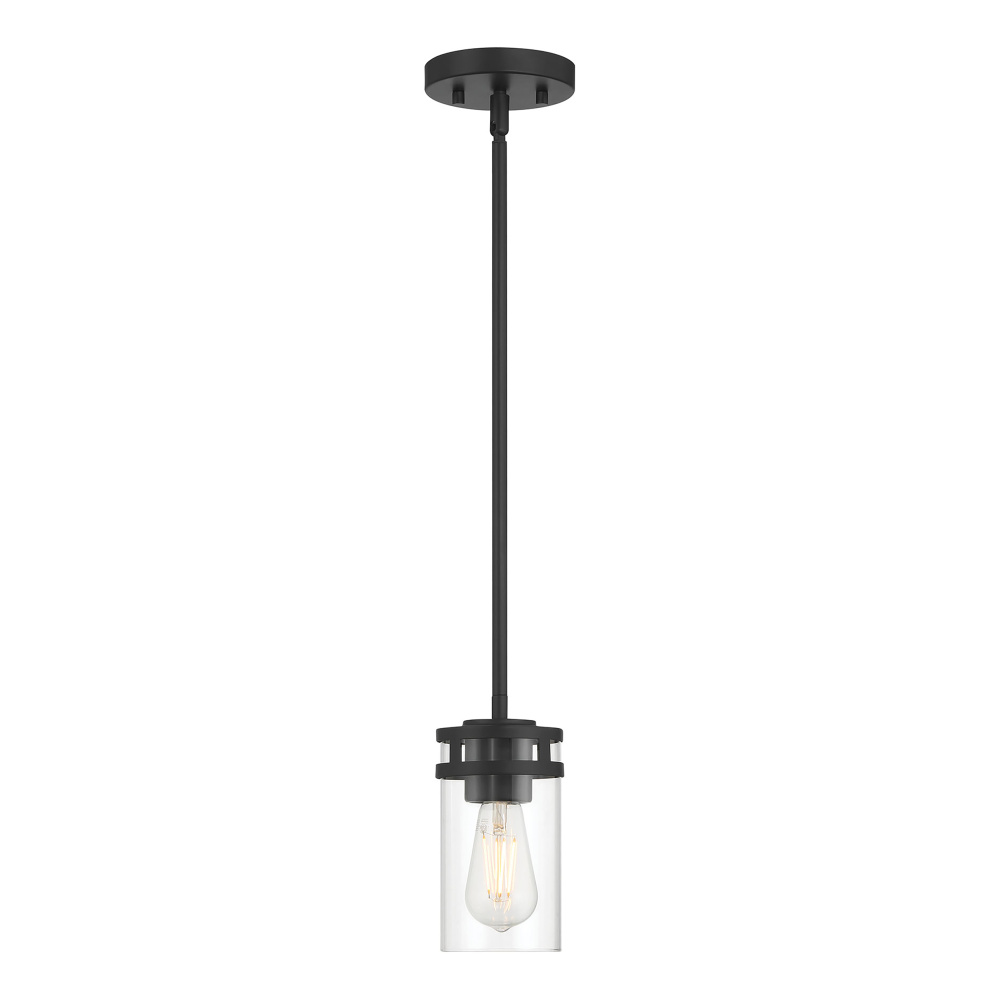 Our Lunden pendant features decorative bands and a clear, cylindrical shade.