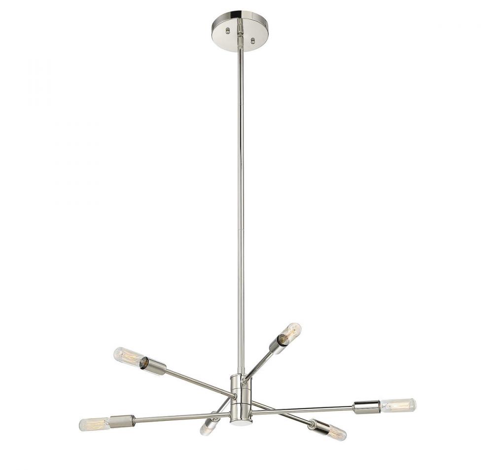 The open, structured look of the Savoy House Lyrique 6-light chandelier is a great choice for today's stylish interiors. The arms are adjustable, allowing you to create custom looks and change them on the fly. Finished in polished nickel. The hanging height is adjustable and this fixture can be mounted on a sloped ceiling. Chandeliers can be used in a wide variety of spaces, including but certainly not limited to dining rooms, living rooms, great rooms, bedrooms, kitchens, foyers, offices and even bathrooms! Bulbs not included. Try using stylized bulbs such as tubular shape for a different look! The polished nickel finish can be matched with nickel hardware or mixed with hardware in other finishes. Lyrique is perfect for contemporary style spaces and any room that has an edgy touch. When you choose a Savoy House lighting fixture, you can be certain you’ve selected a piece that will withstand the test of time.