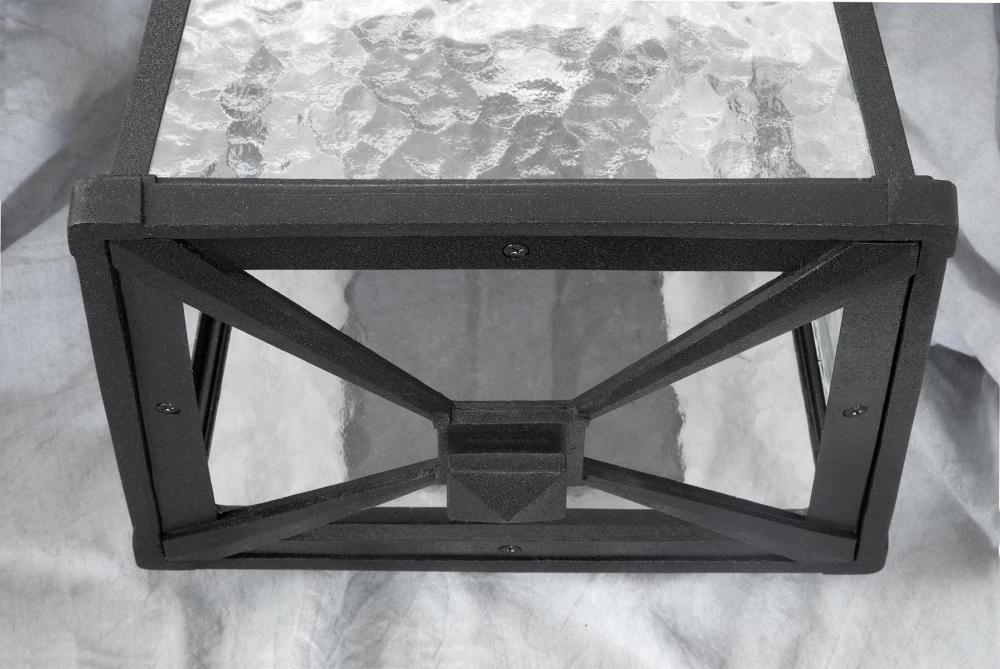 Classic arts and crafts inspired profile.;Cast aluminum construction with clear water glass.;Textured black powder coated finish.;One-light large wall lantern.